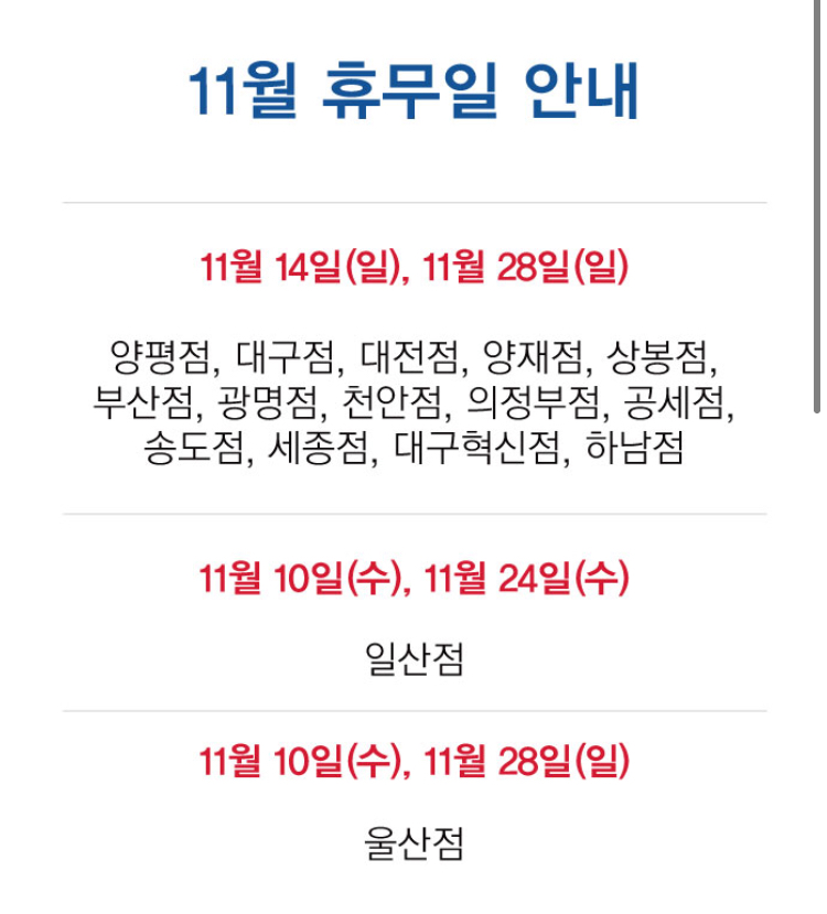 - 대전점, 세종점, 천안점, 하남점, 양평점, 상봉점, 일산점, 의정부점, 울산점, 부산점 오전 10:00 - 오후 10:00