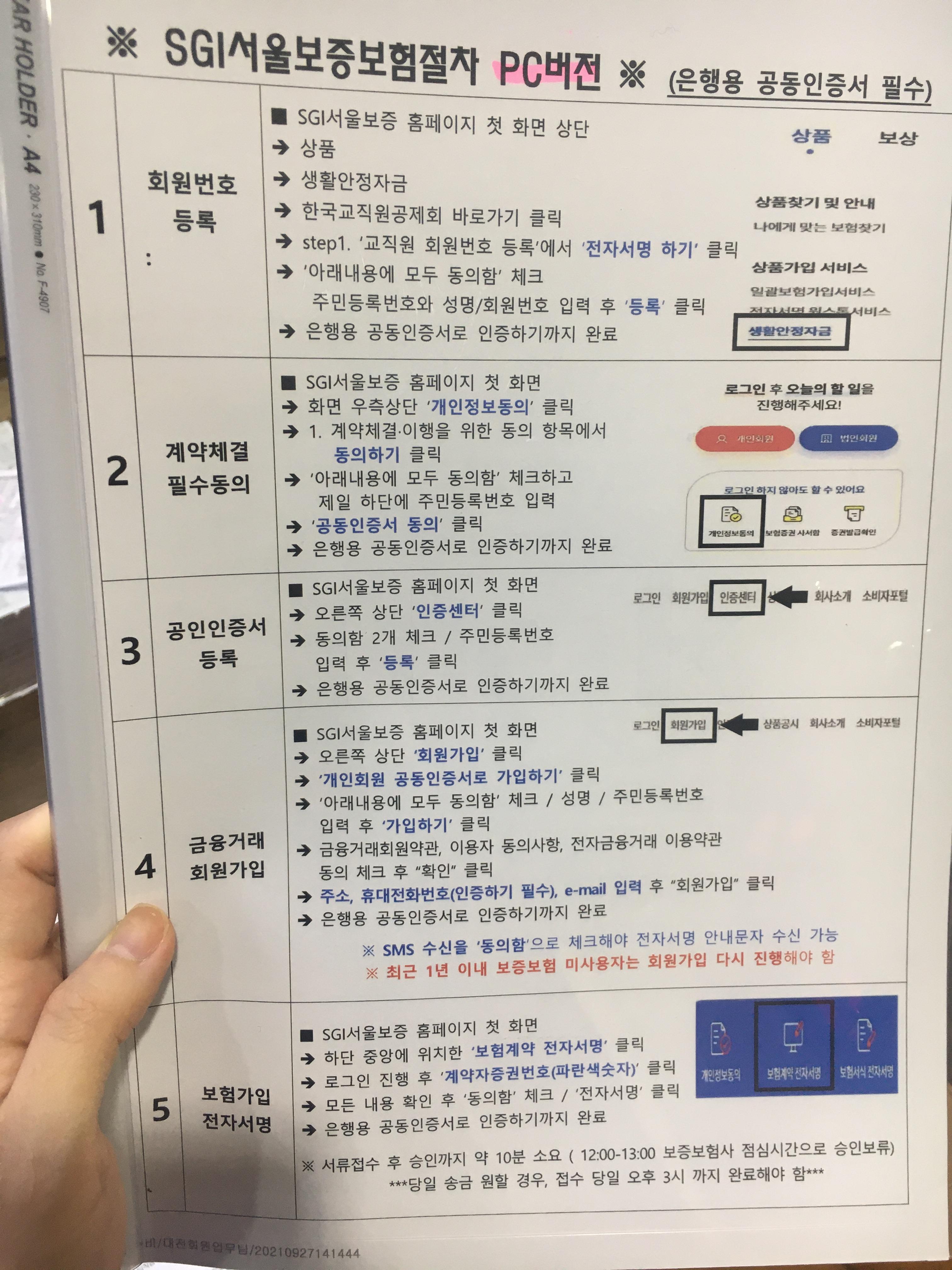 - PC 진행 방법: SGI서울보증 홈페이지(http://www.sgic.co.kr) → 상품 → 상품가입서비스 → 생활안정자금 → The-K 한국교직원공제회 하단의 바로가기 → 교직원생활안정자금 → STEP1. 교직원회원번호등록 , STEP2. 계약체결필수동의 2건 각각 전자서명 진행