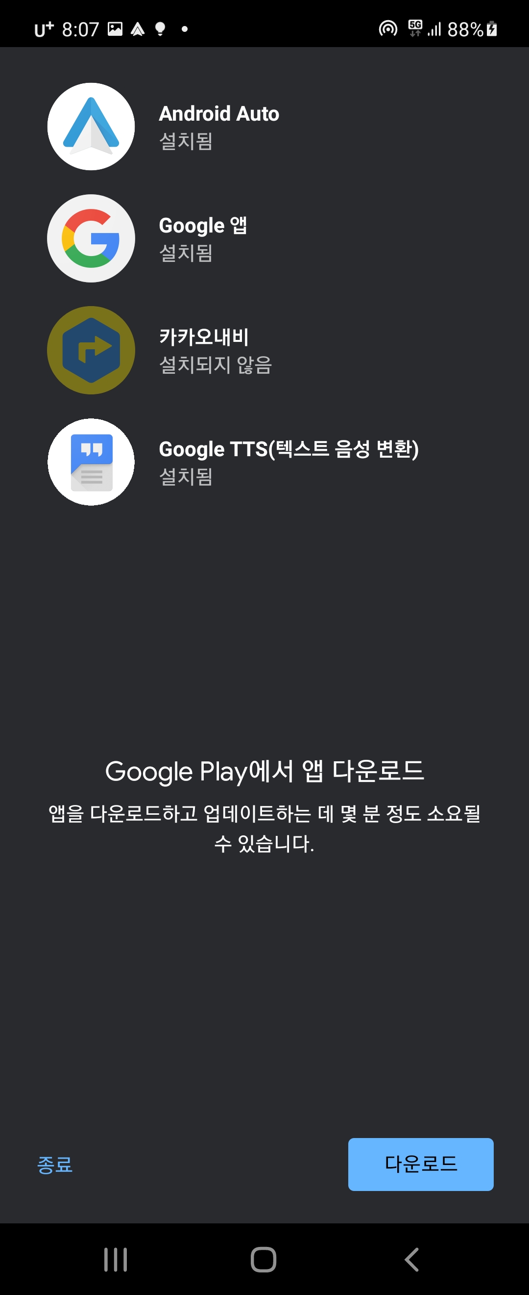 안드로이드 오토, 구글앱, 카카오내비, 카카오맵, 구글 TTS가 설치되어야 한다.