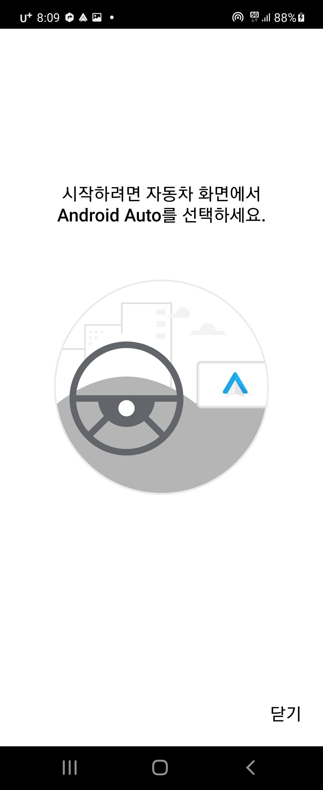 C타입 USB를 차량과 연결하면 다음과 같은 안내가 나오는데, 안드로이드 오토 지원이 되는 차량인지, 안드로이드가 최신 업데이트가 되어있는지 네트워크 신호강도가 어떤지 여부를 확인해야한다고 한다.