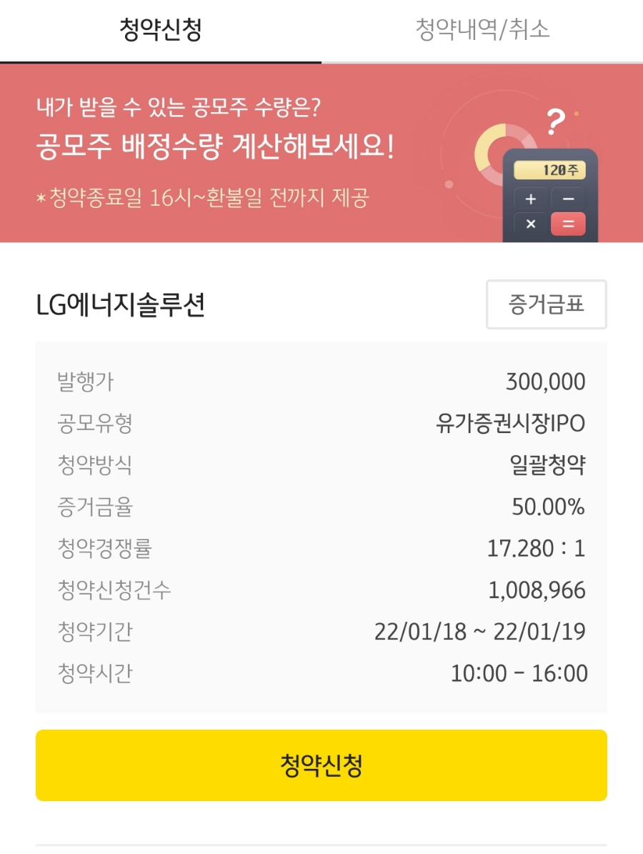 현재 엘지에너지솔루션은 첫날 정오 17:1의 경쟁률을 보이고 있다. (최대주관사인 kb에서! 여러 계좌가 있다면 둘째날 오후인 19일에 경쟁률을 보고 선택해서 넣어도 좋을 것 같다. 청약 시간은 오후 4시까지니 고민할 시간이 없다면 호다닥 진행을 해보자. 정말 쉽다.