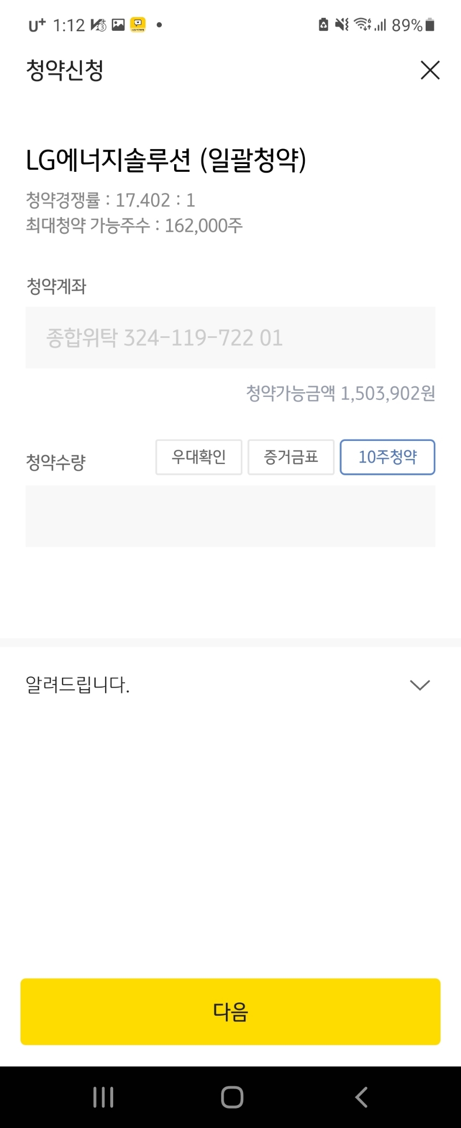 10주 청약을 누르고 다음 클릭!