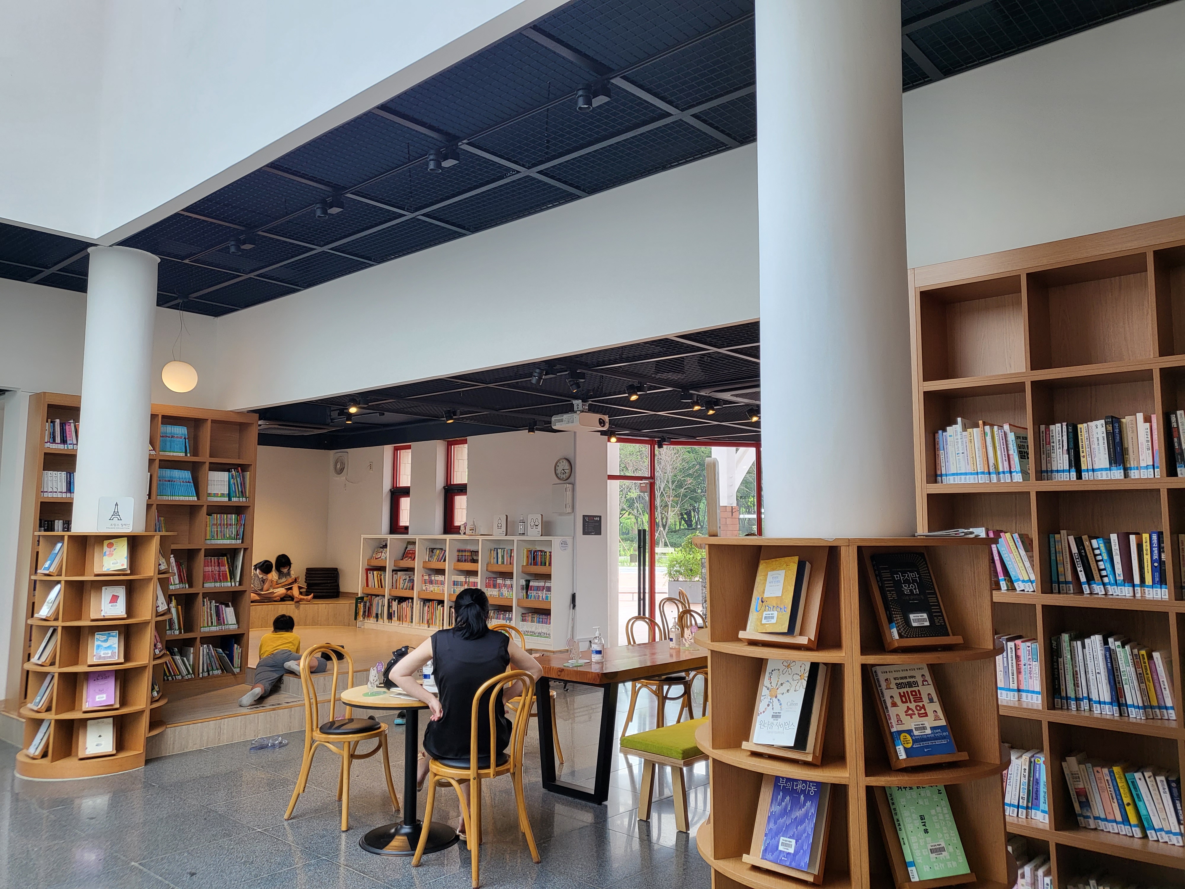 창가쪽 자리도 좋지만 나는 넓은 책상이 좀 더 취향이라 자리를 옮겼다. 읽은 책은 다시 자리에 두면 된다. 바로 옆에 양천도서관이 있지만 잠깐 더위를 시킬겸 간단히 책을 읽기 좋은 쾌적한 공간이다.