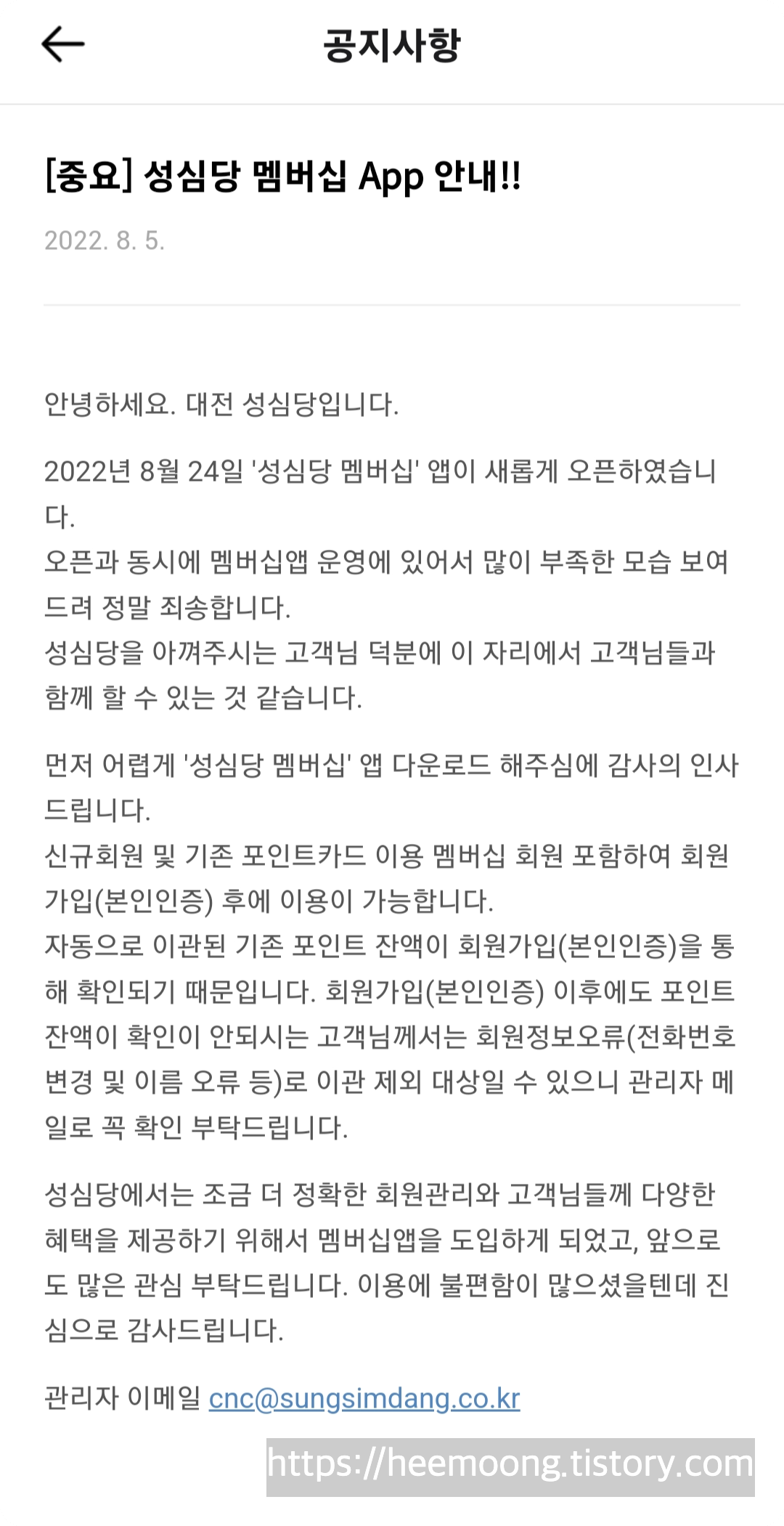 성심당 멤버십앱이 오픈하면서 과도기간이었던 2022.8.19.~8.23.까지는 포인트 적립이 되지않아 영수증을 지참하면 8월 31일까지 적립을 해준다는 내용으로 아래의 글을 작성했다.