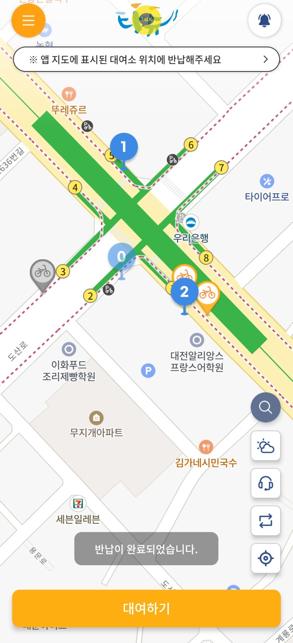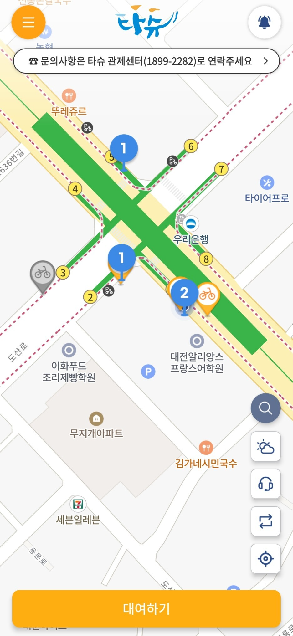 타슈 앱을 접속하면 지금 현재 있는 위치에서 대여할 수 있는 타슈 대수가 파란색 원문자 안에 써져있다. 지금 대여소에 타슈가 없으면 "0"으로 뜬다. 지금 대전 알리앙스프랑스어학원 앞에있는 대여소에 파란 원문자 2라고 적혀져있고 실제로 2대가 있다.