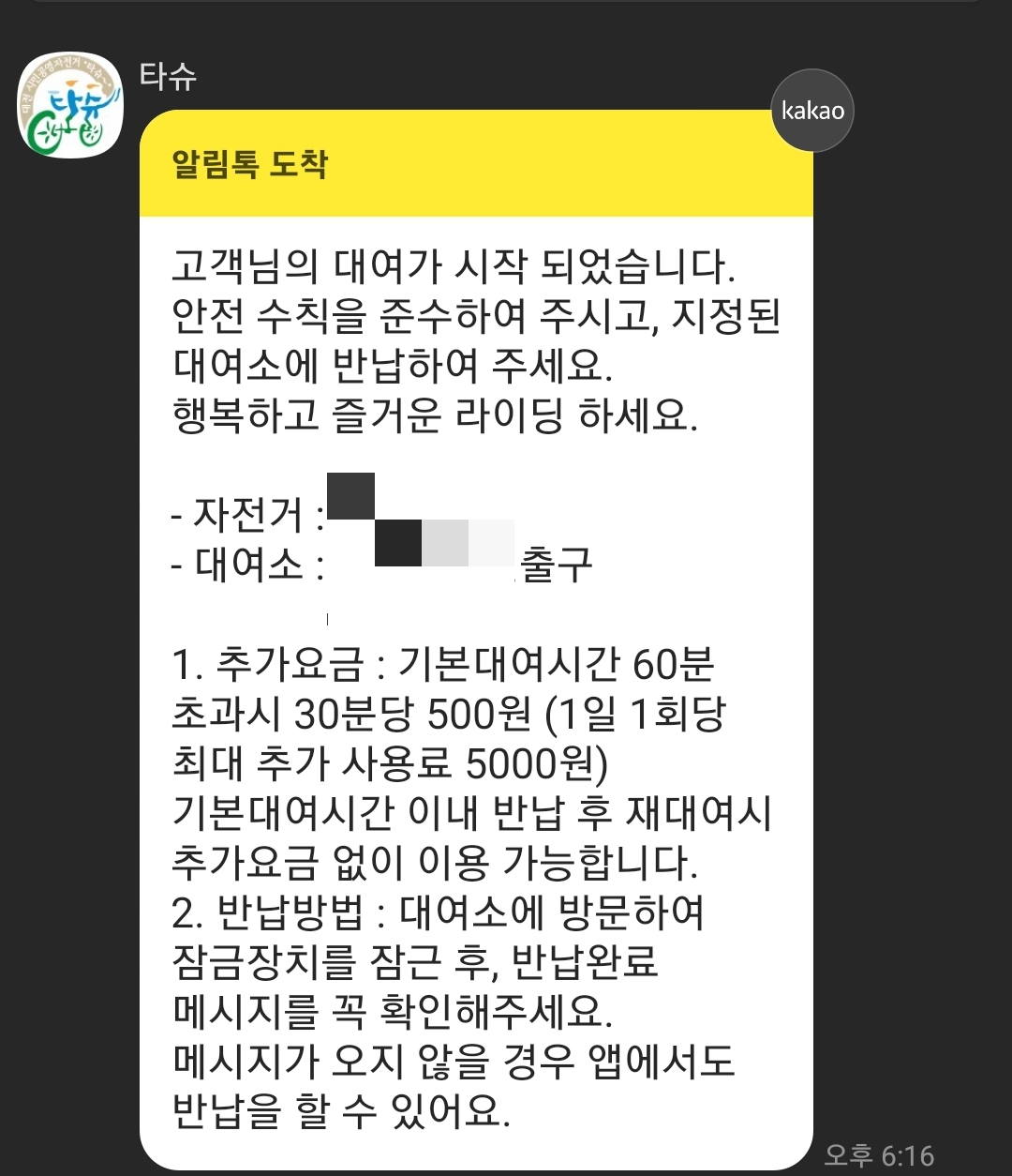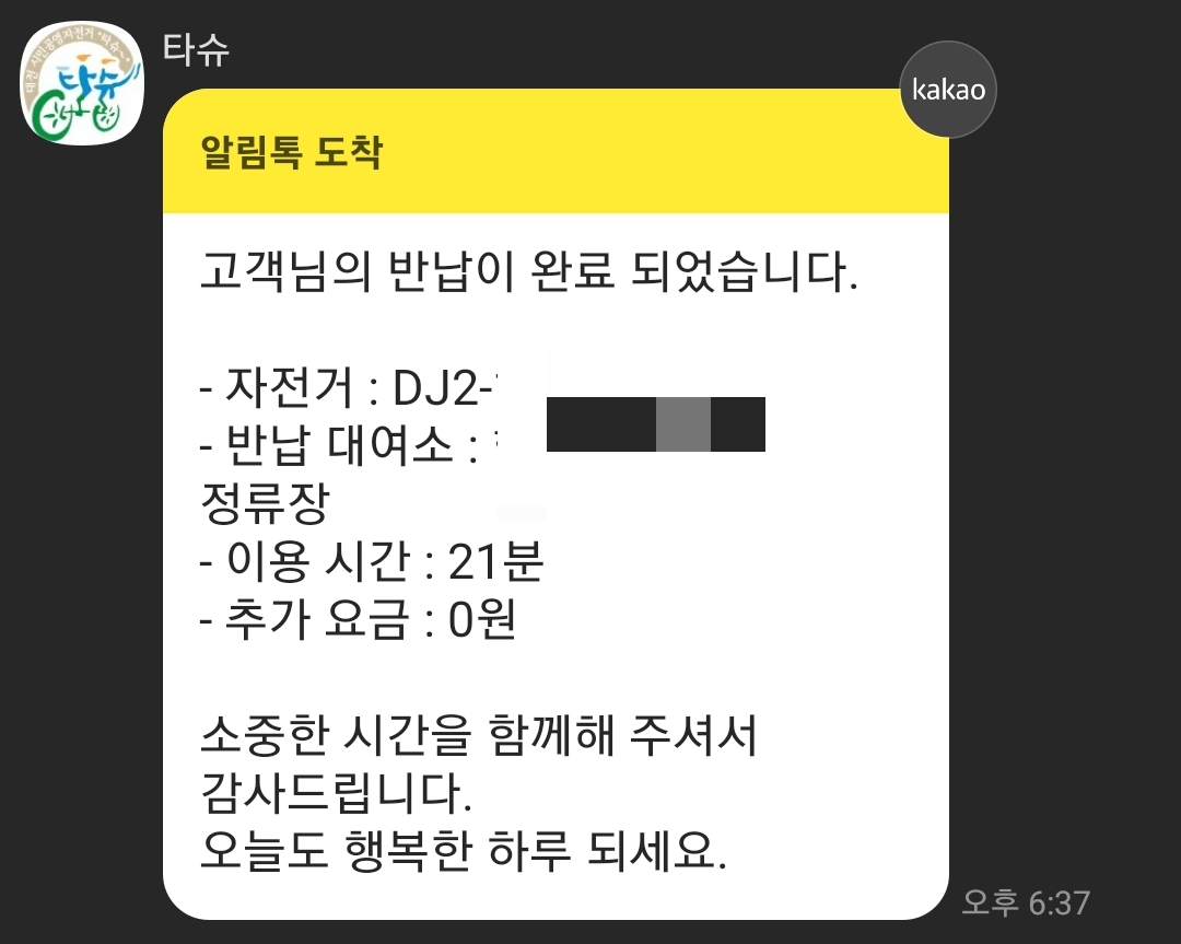 반납완료 메시지를 확인하면 반납이 된 것! 기다려도 메시지가 오지 않는다면, 타슈 앱에서 "앱에서 반납" 버튼을 누르면 반납 처리가 된다. 반드시 반납 완료 메시지를 확인해야 한다. 과금의 원인이 될 수 있다.