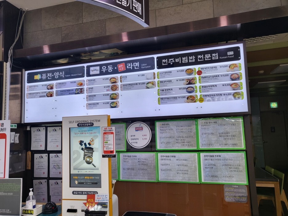 비빔밥/우동/라면/퓨전/양식 등을 판매하고 있으며 키오스크 주문을 하고 전광판에 본인 번호가 뜨면 수령하는 방식이다. 5분 내외로 빠르게 음식이 나오는 편이다.