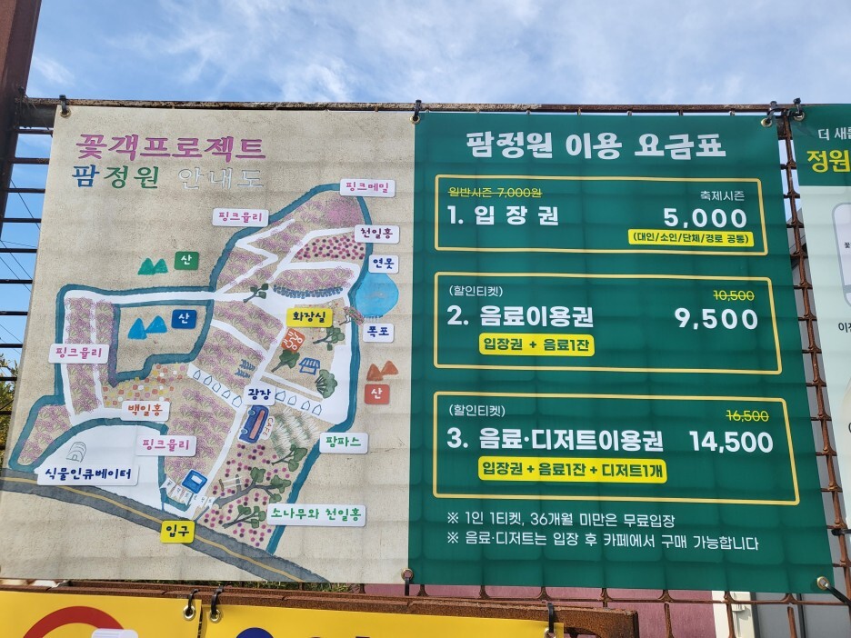입장권은 일반시즌은 7000원이라고 하는데 축제시즌에는 대인/소인/단체/경로 공통 5000원이다. 음료1잔이 포함된 가격은 9500원, 음료+디저트 이용권은 14500원이다. 음료맛이 엄청 좋다는 소문은 못 들어서 그냥 입장권 2장만 구매했다.
