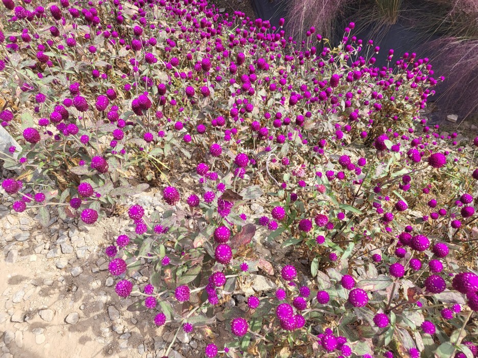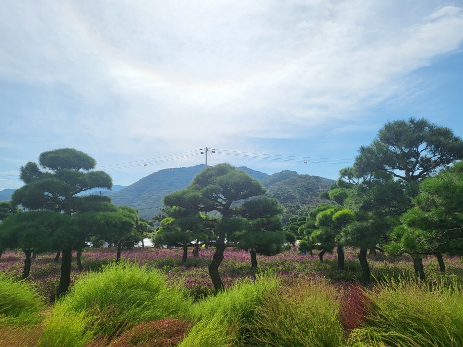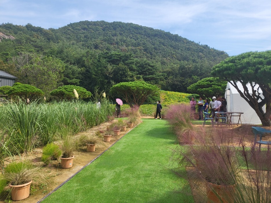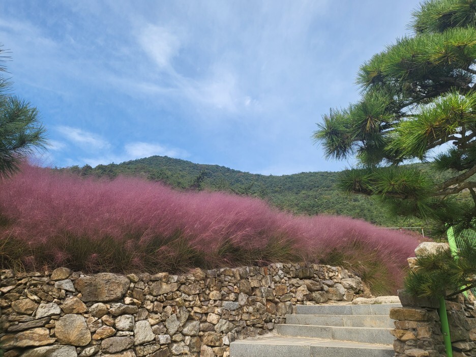 입구로 들어가 소나무와 천일홍을 지나 팜파스, 연못을 지나면 다시 천일홍, 핑크메밀을 지나 계속 핑크뮬리밭이 이어지는 코스다.