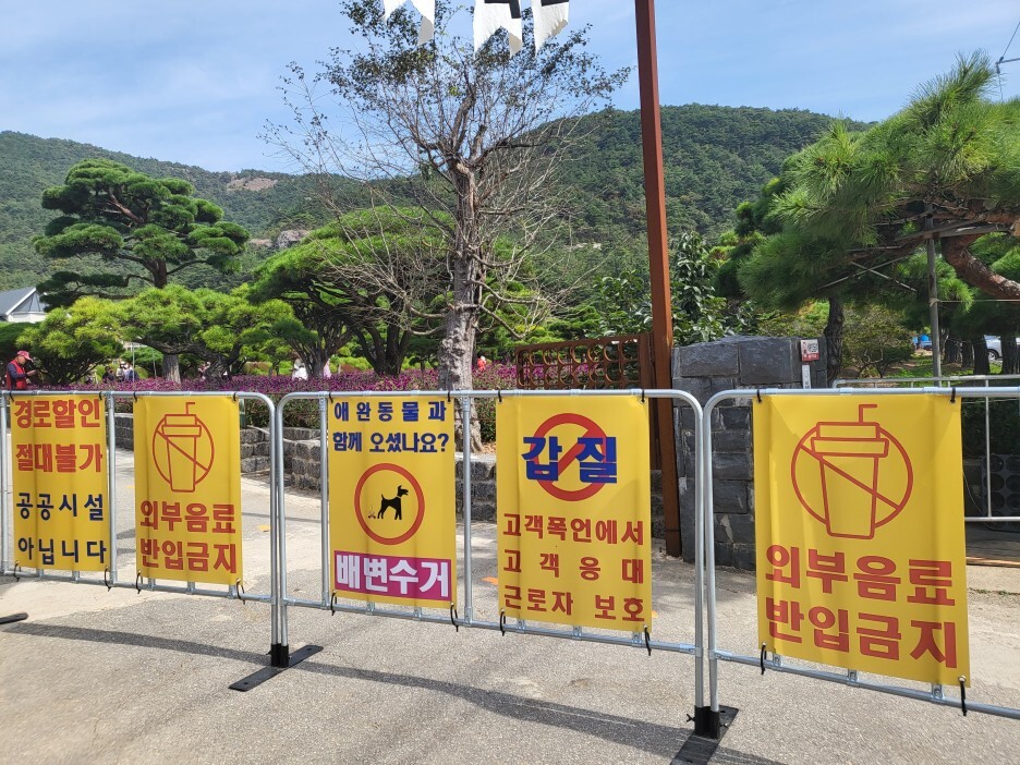 공공시설이 아니라 경로할인 안 된다는 점! 외부 음료는 반입이 안된다는 점! 갑질금지! 애완동물이랑 같이 와도 되지만 당연히 배변은 수거하라는 경고문이 붙어있다.