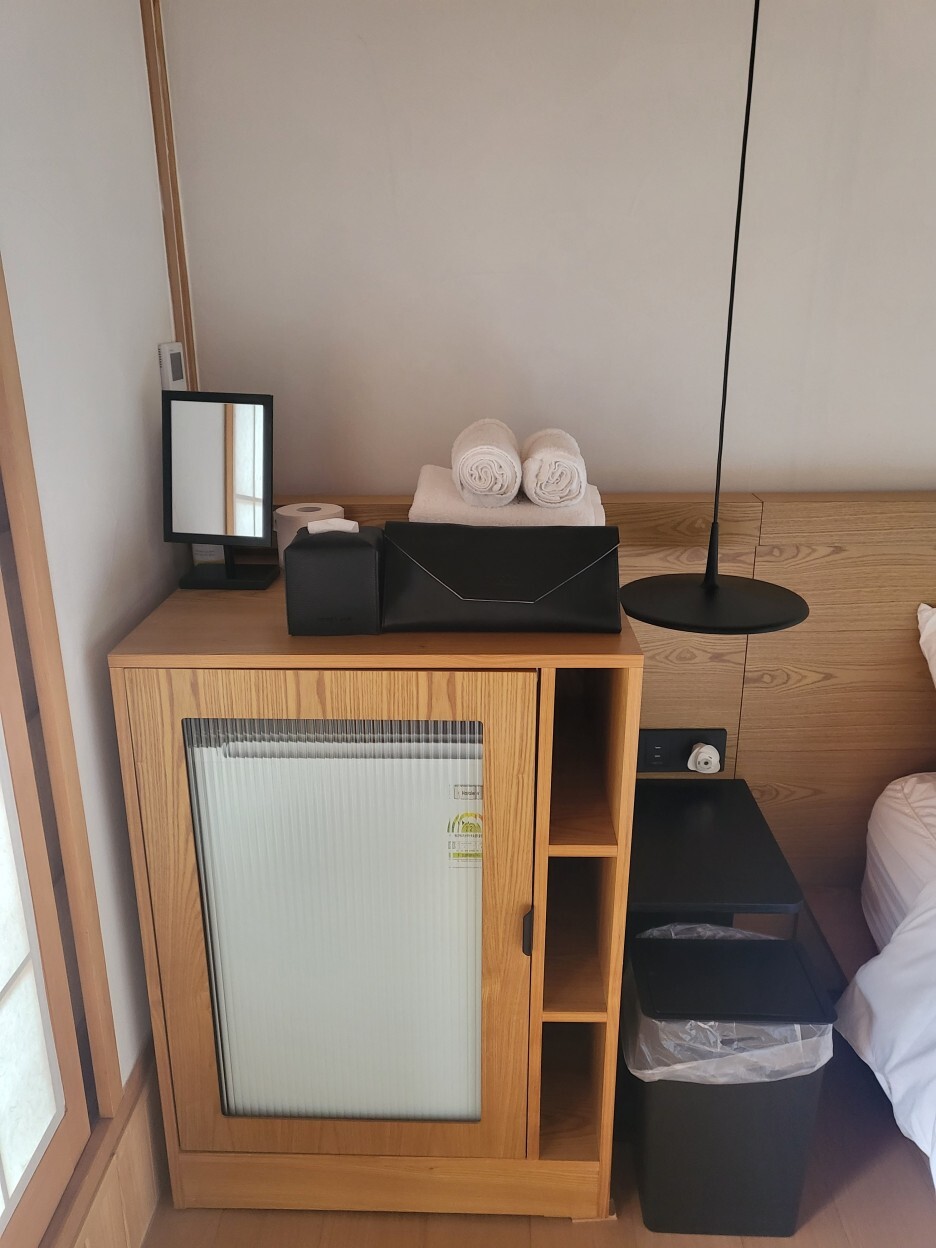 화장대나 티테이블이 없다. 저 작은 거울에 의지해서 로션도 바르고, 화장도 해야 함! 맨 위에 냉동실이 있는 냉장고가 있다. 안에 생수 4병이 들어있다. 옆에 휴지통도 있고 무튼 작은 공간을 잘 채워놓았다는 생각이 듦.