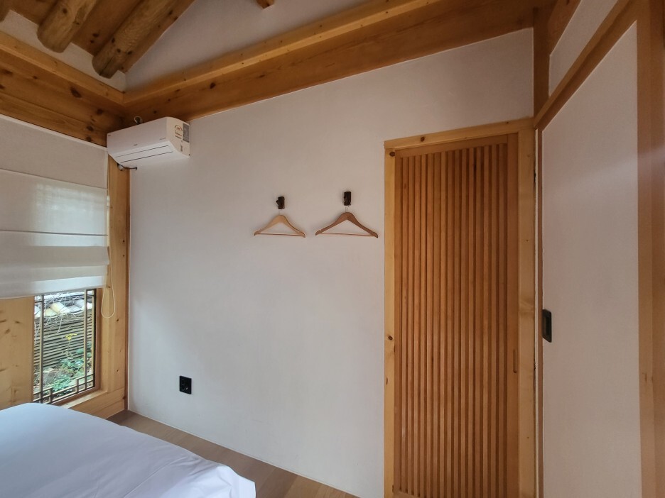 그나마 층고가 높아서 누워있을 때 엄청 좁다는 느낌은 들지 않는다. 하지만 내부에서 앉아서 뭘 먹거나 시간을 보내기에는 부족한 면이 있다. 에어컨도 있고 미니멀하게 옷걸이를 걸어둔 것도 예쁘다. 나무 미닫이 문을 열면 화장실이 있다.