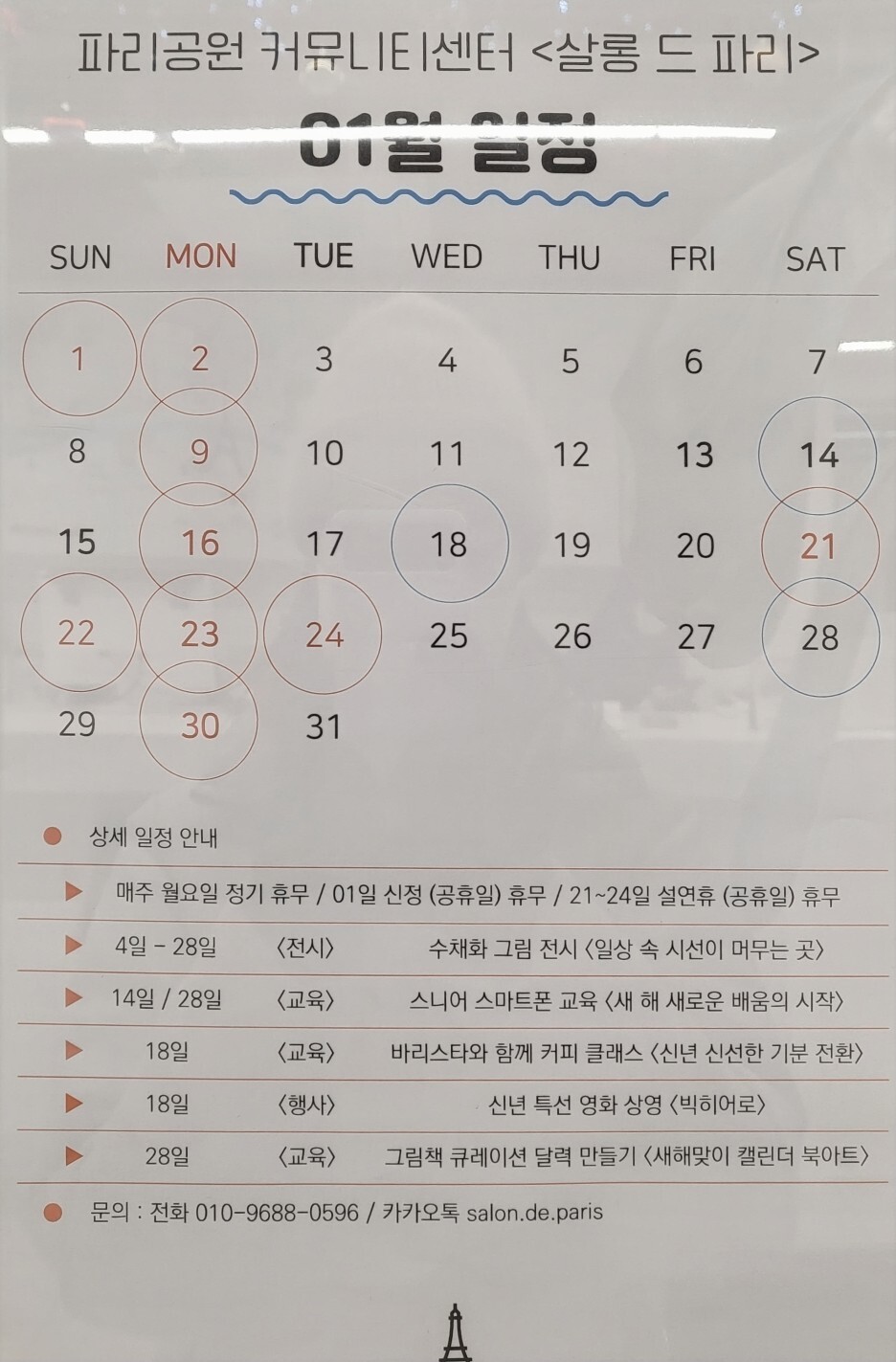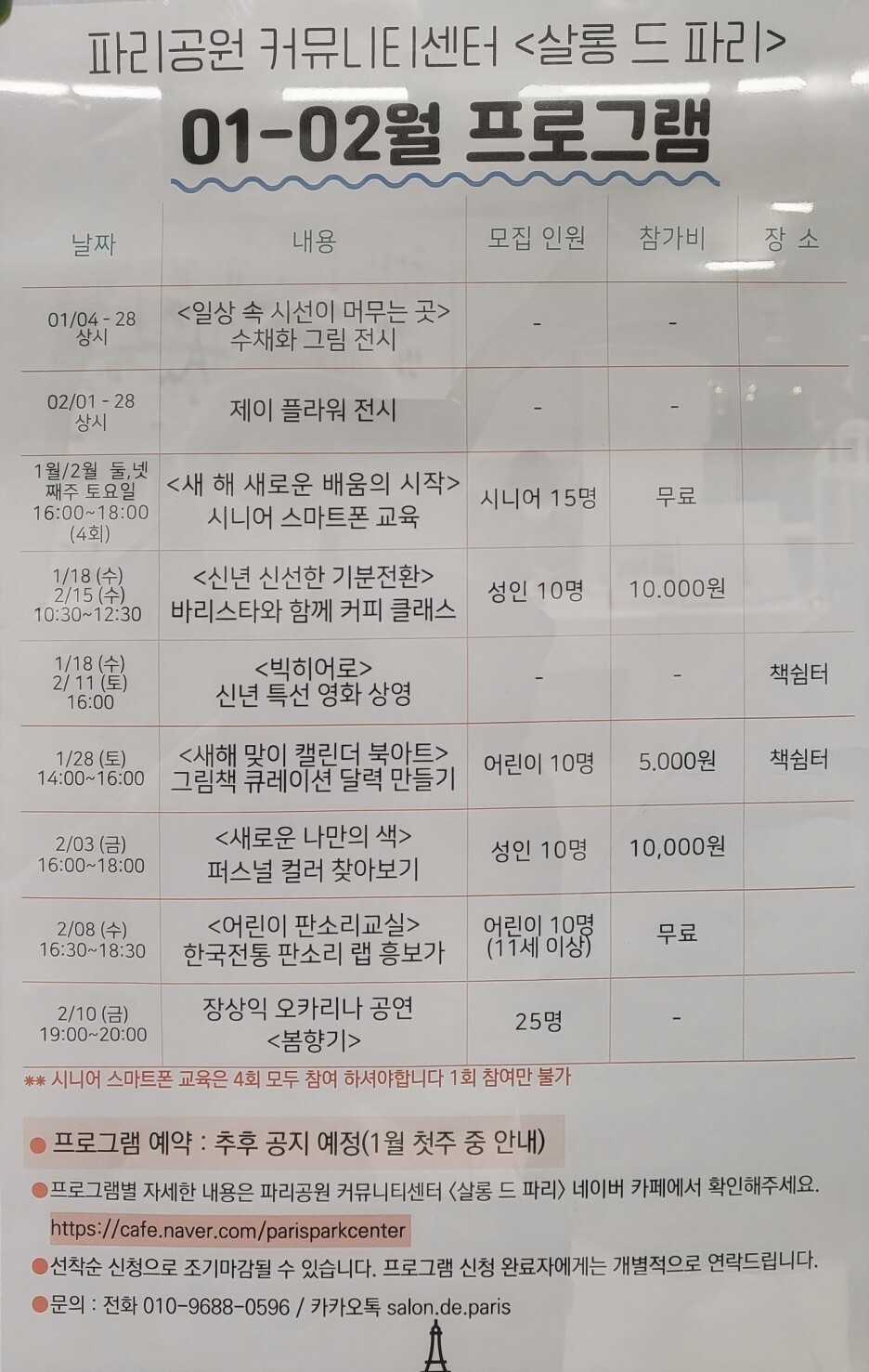 파리공원 커뮤니티센터인 살롱 드 파리의 1~2월 프로그램은 아래와 같다.