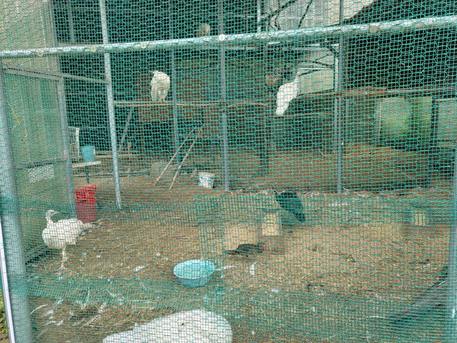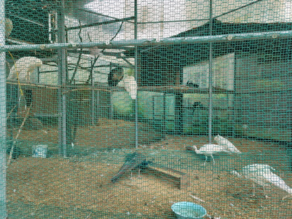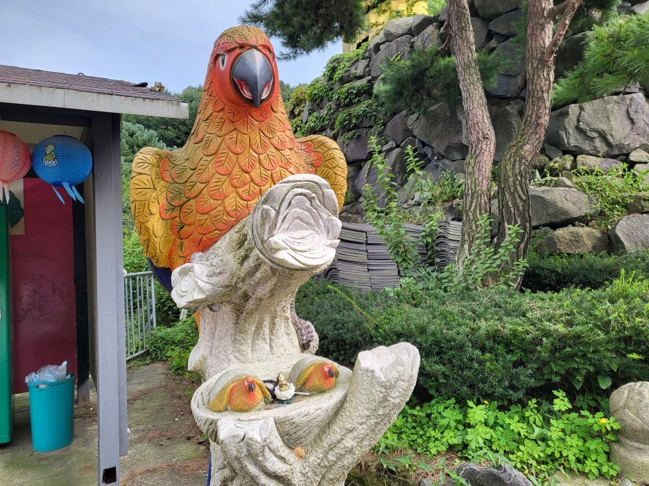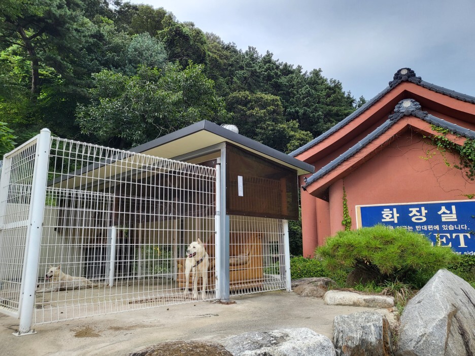 불두상 뒤편으로 화장실과 백구, 새장이 있고