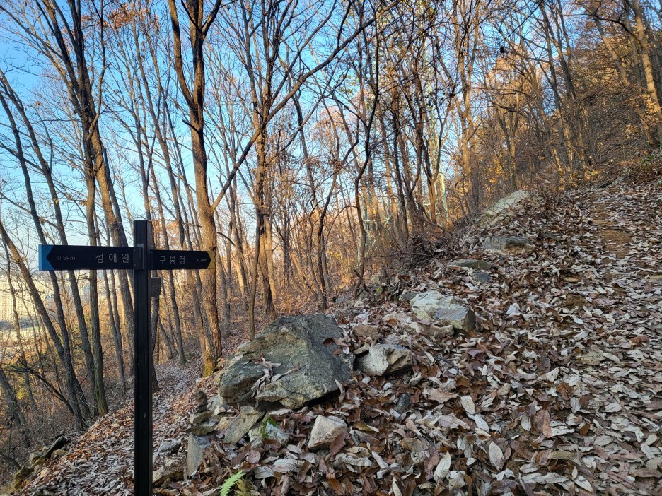 전망대까지 넉넉하게 30분 정도 걸렸고, 경사가 심하진 않은데 그렇다고 둘레길 같은 코스는 아니었다. 등산을 하는 느낌을 낼 수 있음. 낙엽이 있고 비가 살짝 온 날이라 미끄러웠다. 이런 등산 코스와 철계단이 있는 곳이 섞여 있다.