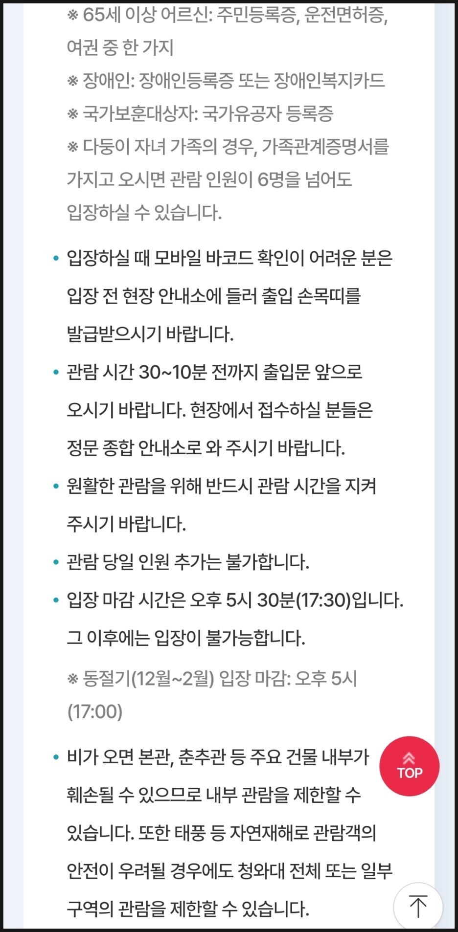 - 입장 마감시간은 오후 5시 30분 (동절기인 12월~2월은 오후 5시)