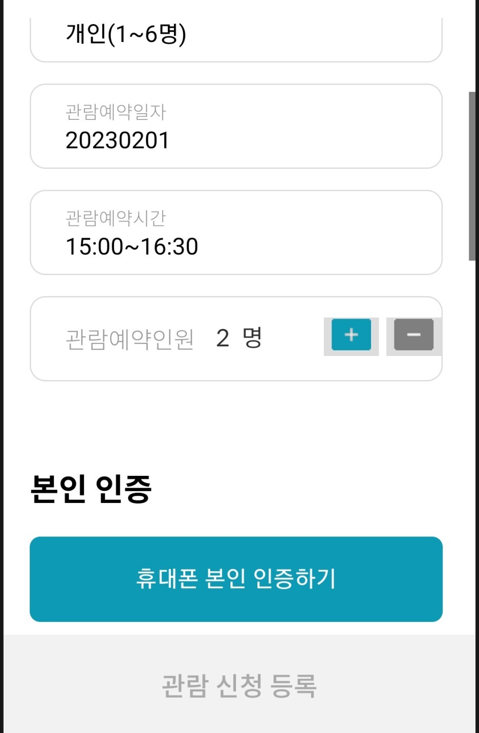 - 개인/단체/ 만65세 이상, 장애인, 외국인, 국가보훈대상자 중 선택