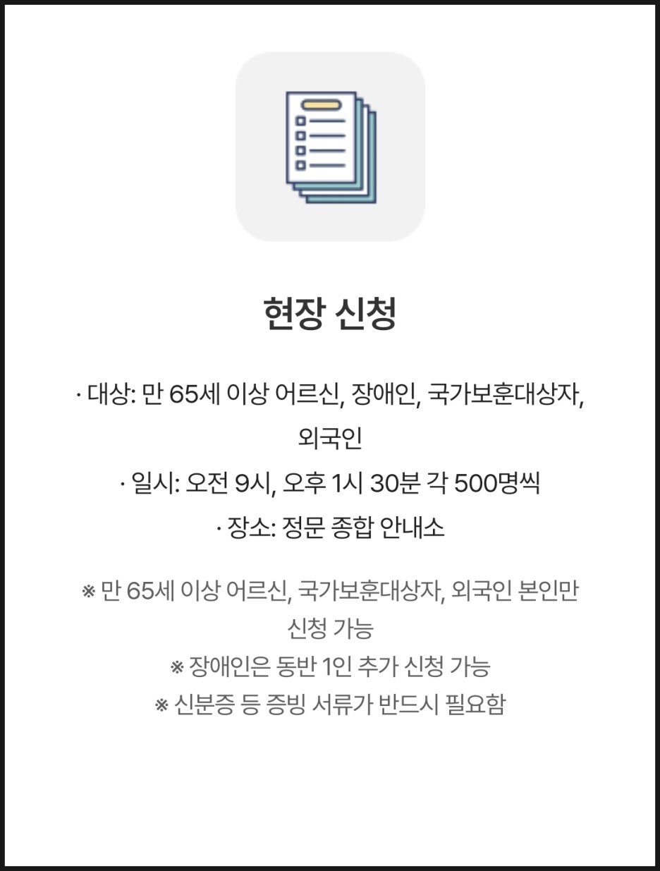 - 만 65세 이상 어르신, 장애인, 국가보훈대상자, 외국인(6명 이하)