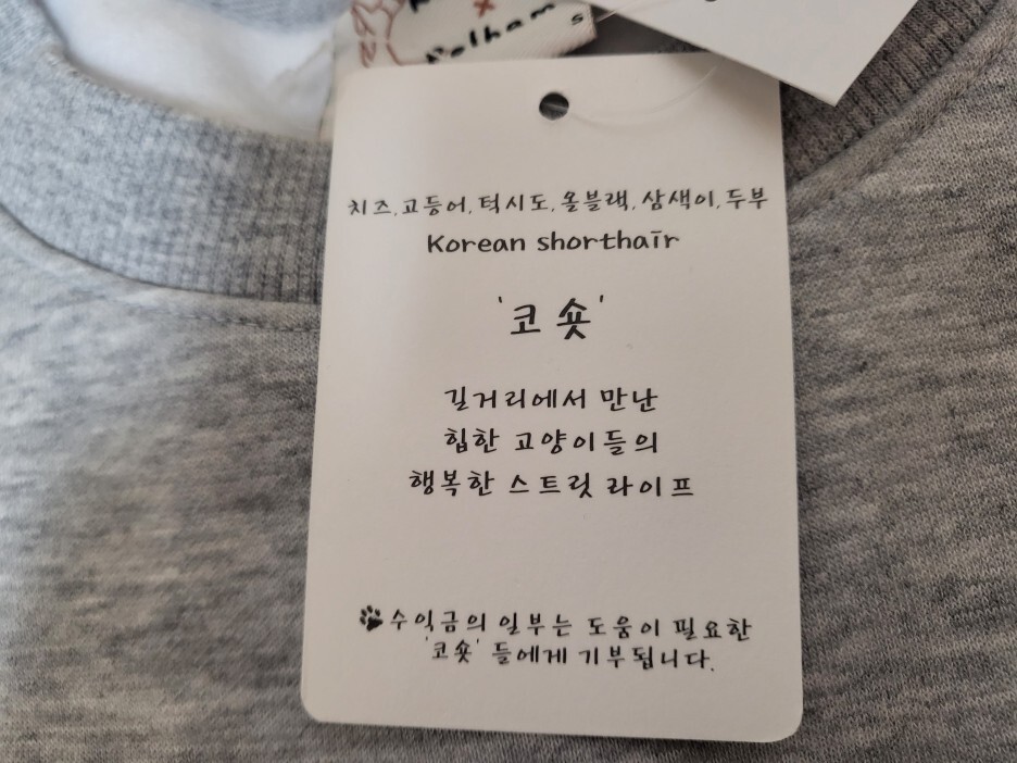 - 코숏 맨투맨으로 수익금의 일부는 도움이 필요한 길거리 고양이들에게 기부된다고 한다. 나름 착한 소비!