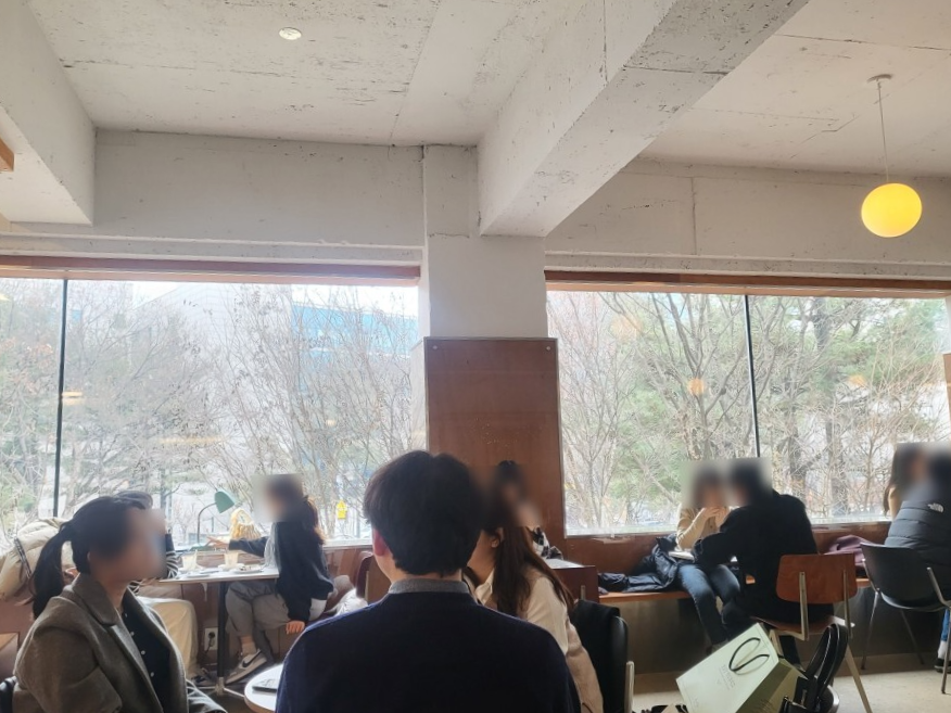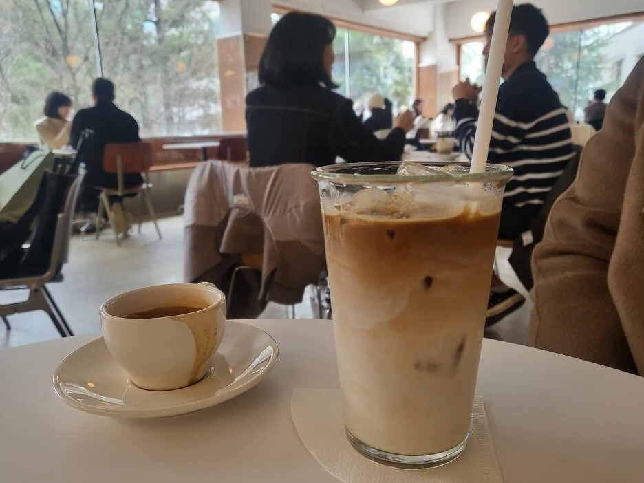 친구의 피넛라떼는 피넛라떼에 샷을 원하는만큼 부을 수 있도록 에스프레소 잔을 따로 주신다. 처음으로 창가 자리를 사수했던 날, 나는 창을 등지고 앉긴했지만 왜인지 창밖이 초록이로 뒤덮이면 더욱 차가자리 경쟁이 심해질 것 같다.