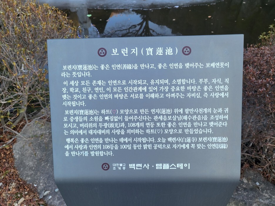저녁 공양을 마치고 보련지에 왔다. 좋은 인연을 만나고, 좋은 인연을 맺어주는 보배연못