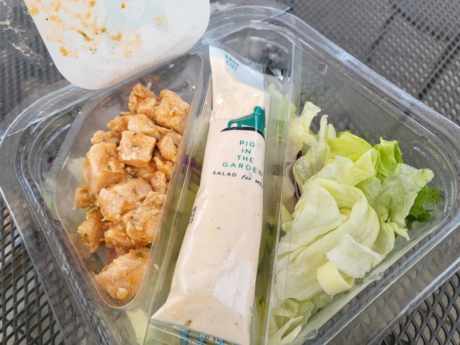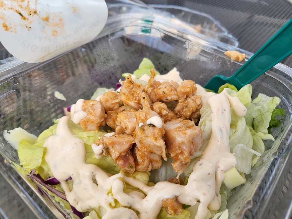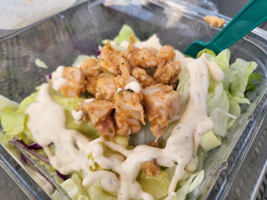 그릴드 치킨은 담백한 편이었고, 샐러드는 신선한 양상추, 적양배추, 치커리 등으로 구성되어있다. 스파이시 랜치 드레싱은 살짝 매운 맛이 나며 전체적으로 잘 어울리고 소스 양도 적당했다. 샐러드를 자주 사먹진 않지만 간단하게 가볍게 한 끼 하기 좋았다.