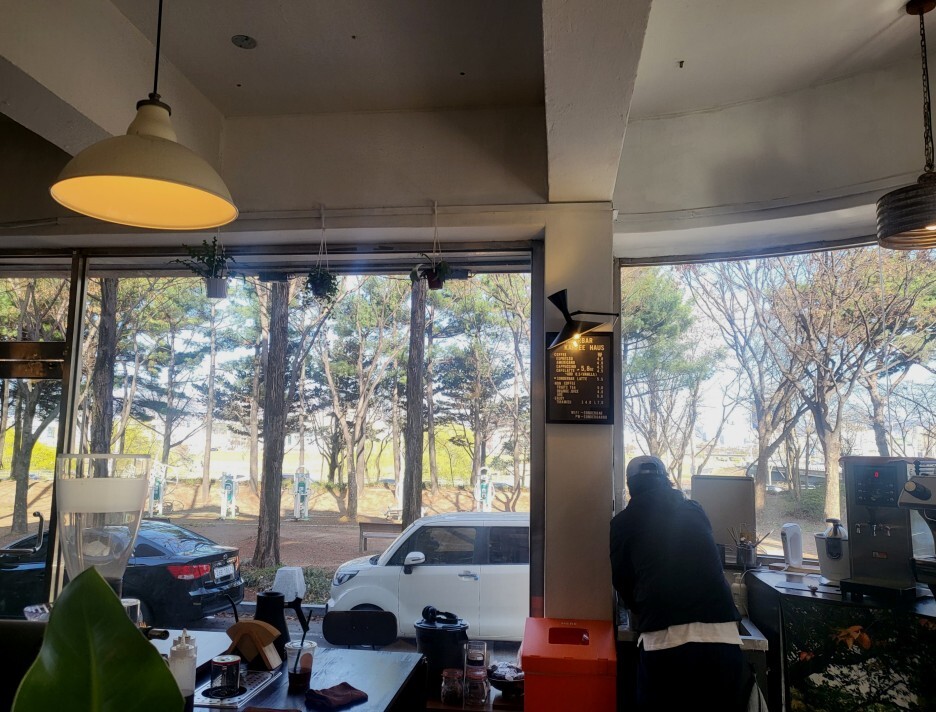 커피를 만들며 유등천쪽을 바라보시는 사장님, 업무만족도가 엄청날 것 같다!