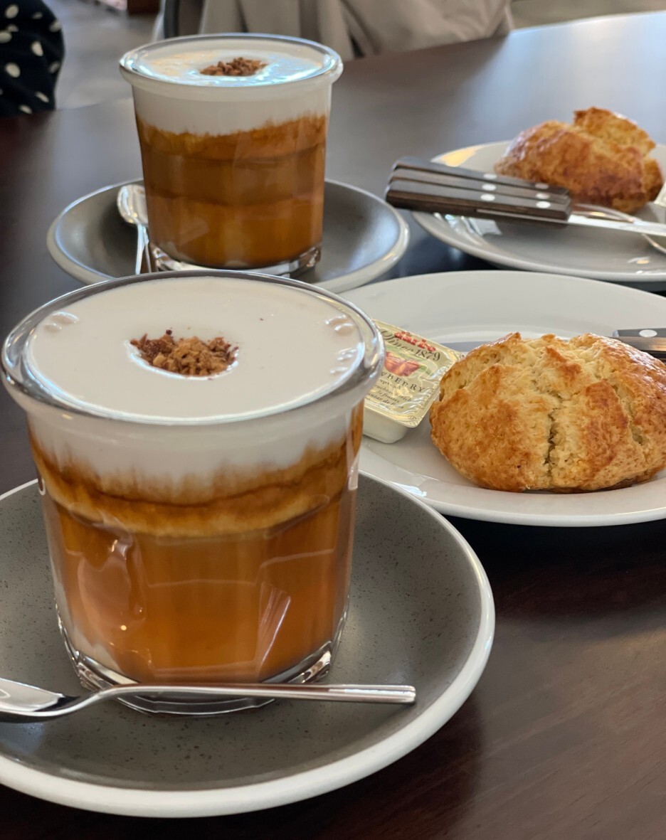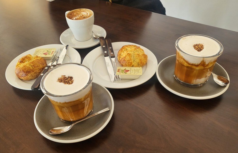 호주산 카푸치노 한 잔과 손더바 라떼 두 잔, 그리고 플레인 스콘 2개 주문했다. 카푸치노 가격은 4500, 손더바 라떼는 5500, 스콘은 3500 가격이 되게 착하다 느껴졌다. 요즘 카페들이 워낙 가격대가 있기도 하고, 음료 자체의 퀄리티가 높았기 때문