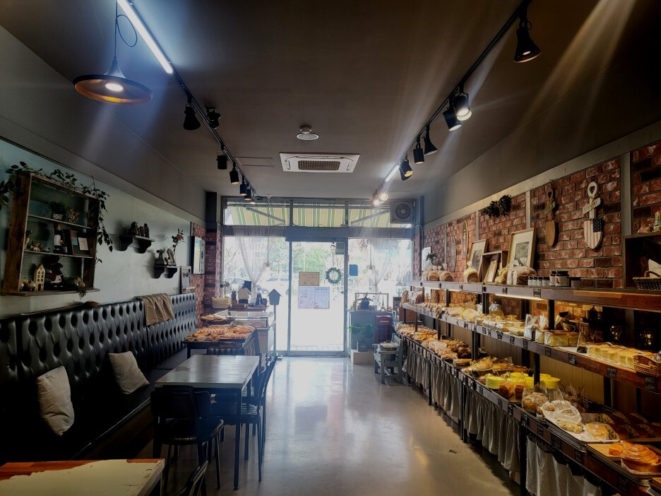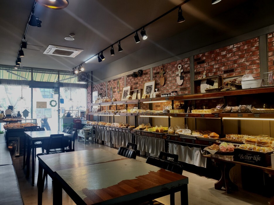 햇살이 들어오는 매장, 빵을 먹고 음료를 마실 수 있는 공간도 있다.