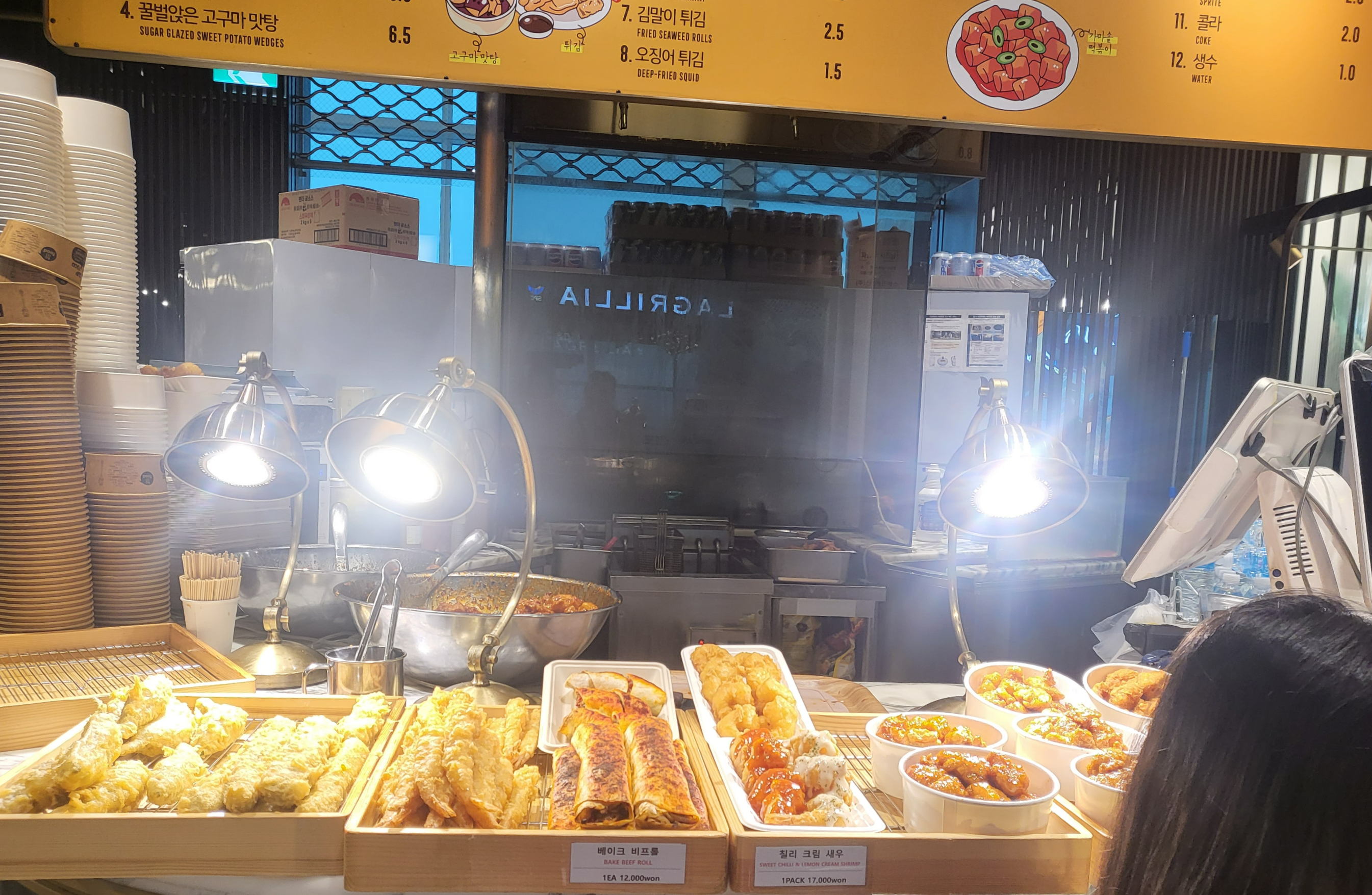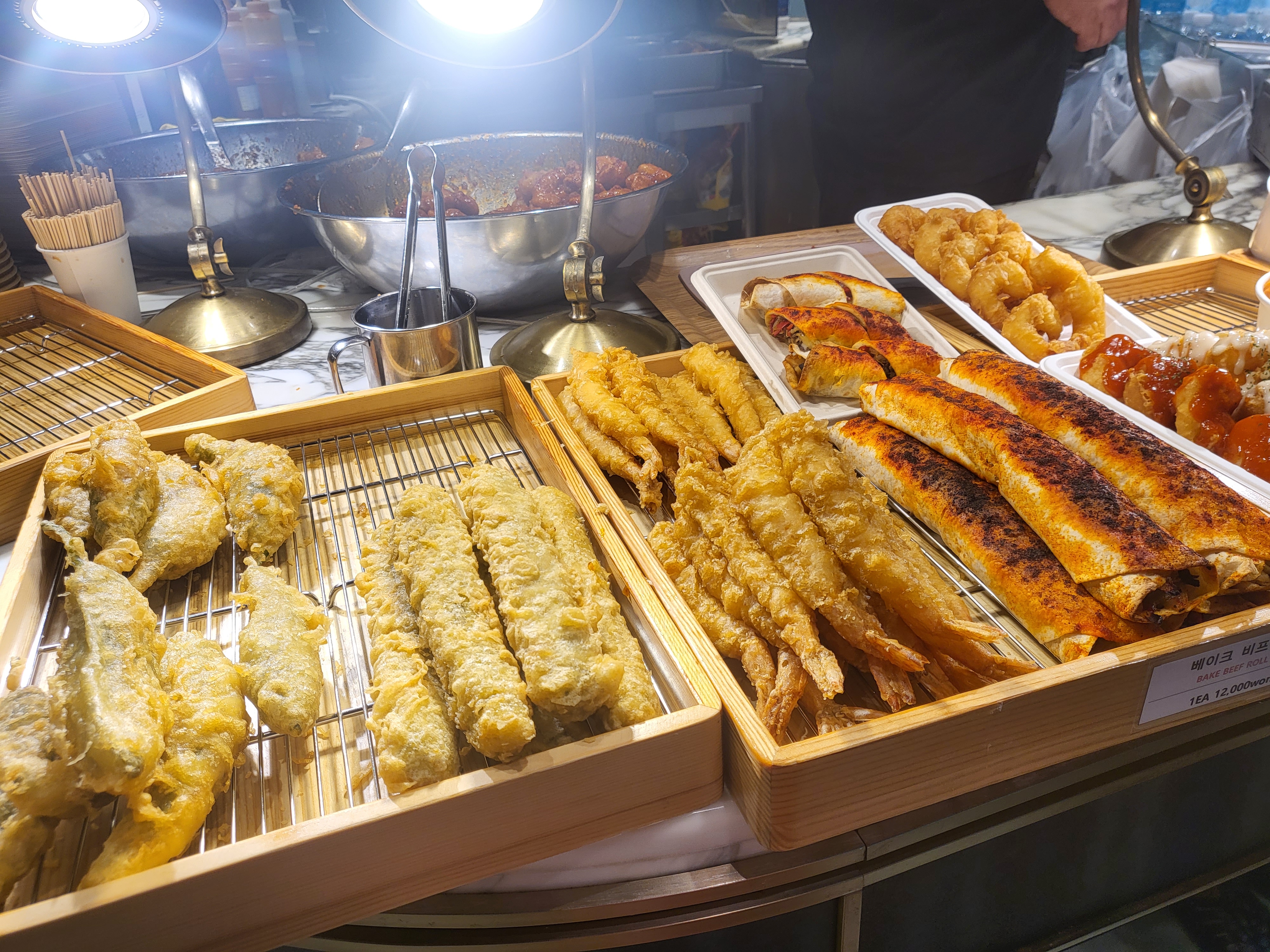 - 각종 튀김류와 닭강정 등이 있음 새우 튀김은 하나에 2500원이라 김말이만 삼
