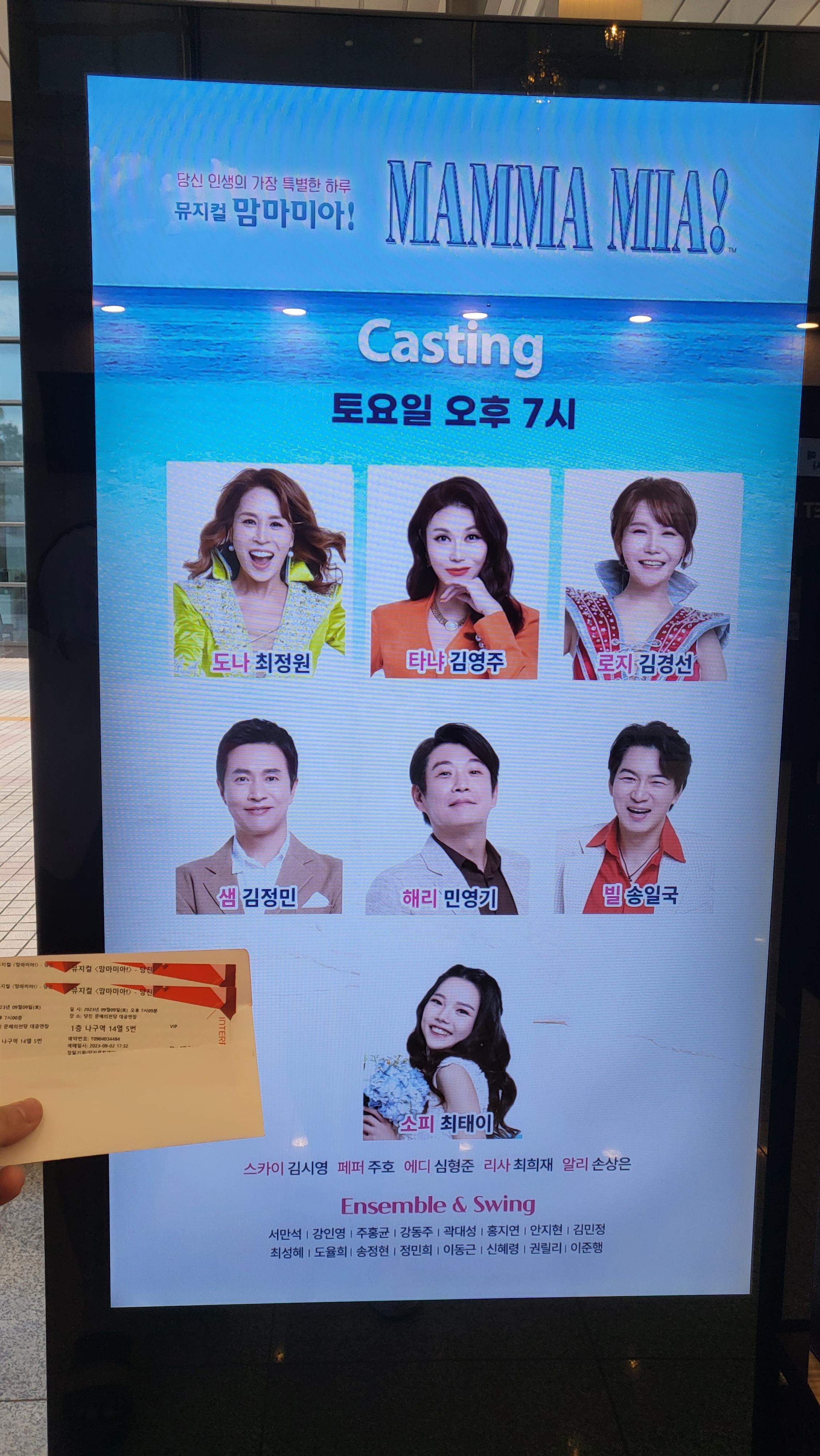 살면서 최정원님 공연을 한 번이라도 꼭 보고싶었는데, 꿈을 이루었다! 최정원 도나의 연기와 노래를 들을 수 있어서 참 값진 공연이었으며! 최태이 소피의 목소리를 명랑하고 맑았다. 김정민, 송일국님을 보았다는 점도 신기했음. 타냐 김영주님의 통통 튀는 매력도 좋았고, 로지 김경선님의 안정적인 보컬도 인상적이었음.