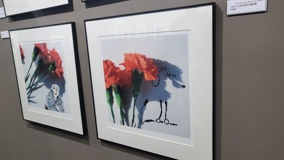 그가 자주 사용하는 게 유리잔, 꽃, 가을의 오브제, 가위 등이었는데 카네이션으로 푸들 블러썸과 푸들 주인인 여인을 그려냈다. 두 작품이 이어진게 재밌었다.