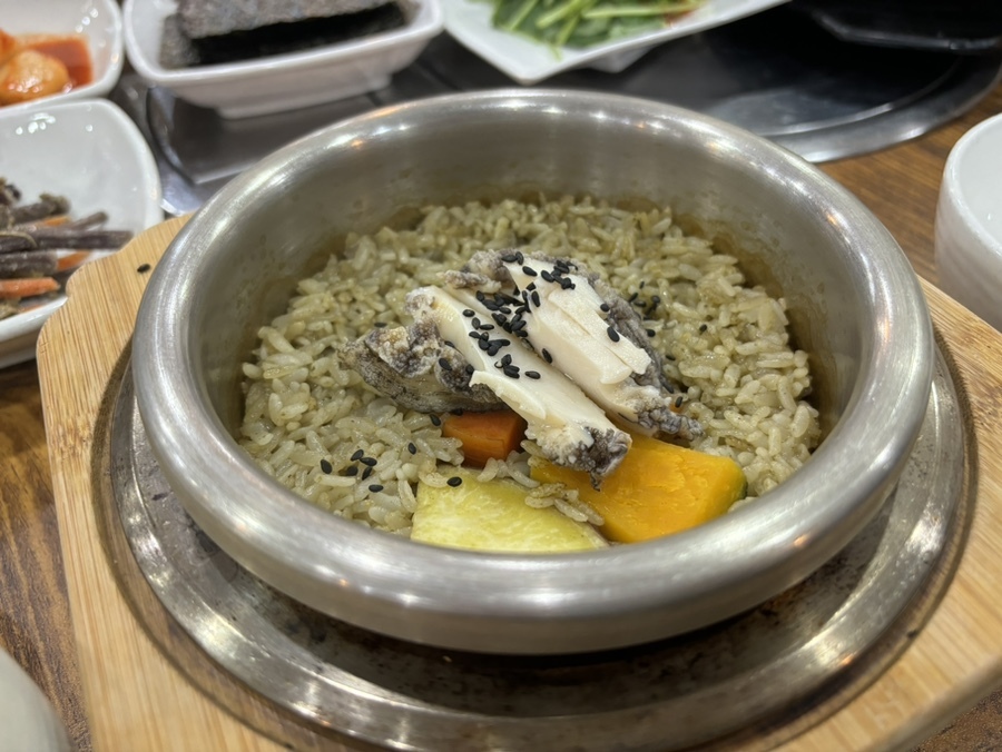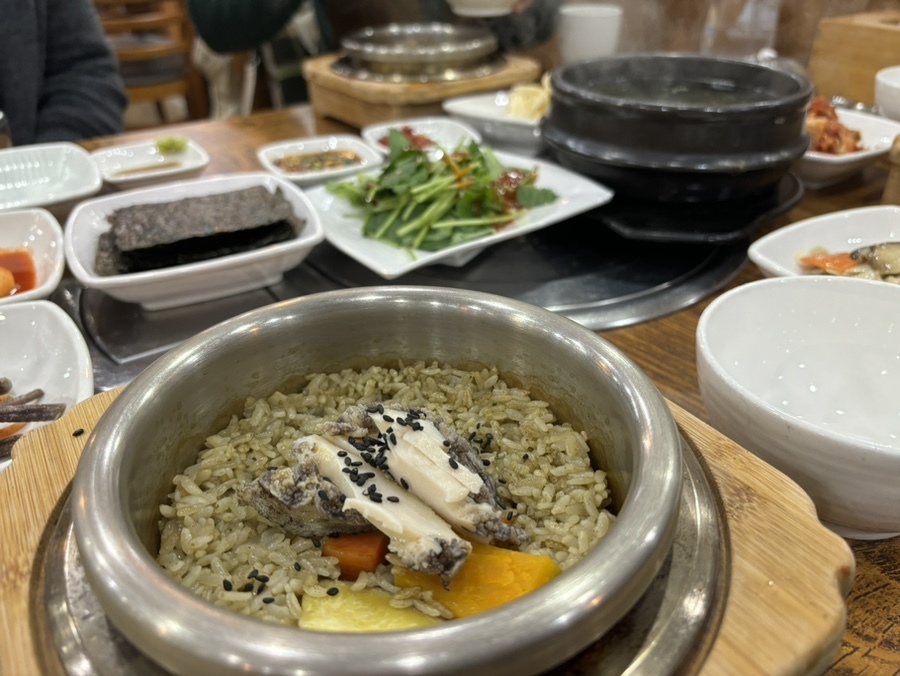 밑반찬들도 맛있는 편이었고! 빈 밥그릇에 솥밥을 옮겨 담은 후 솥엔 미역국을 덜어먹으면 된다. 물을 따로 주지 않는게 전복솥밥 특징인데 나름 잘 어울리는 맛이다. 건강하면서도 맛있어서 부모님과 다시 찾고 싶은 그런 맛집이었다.