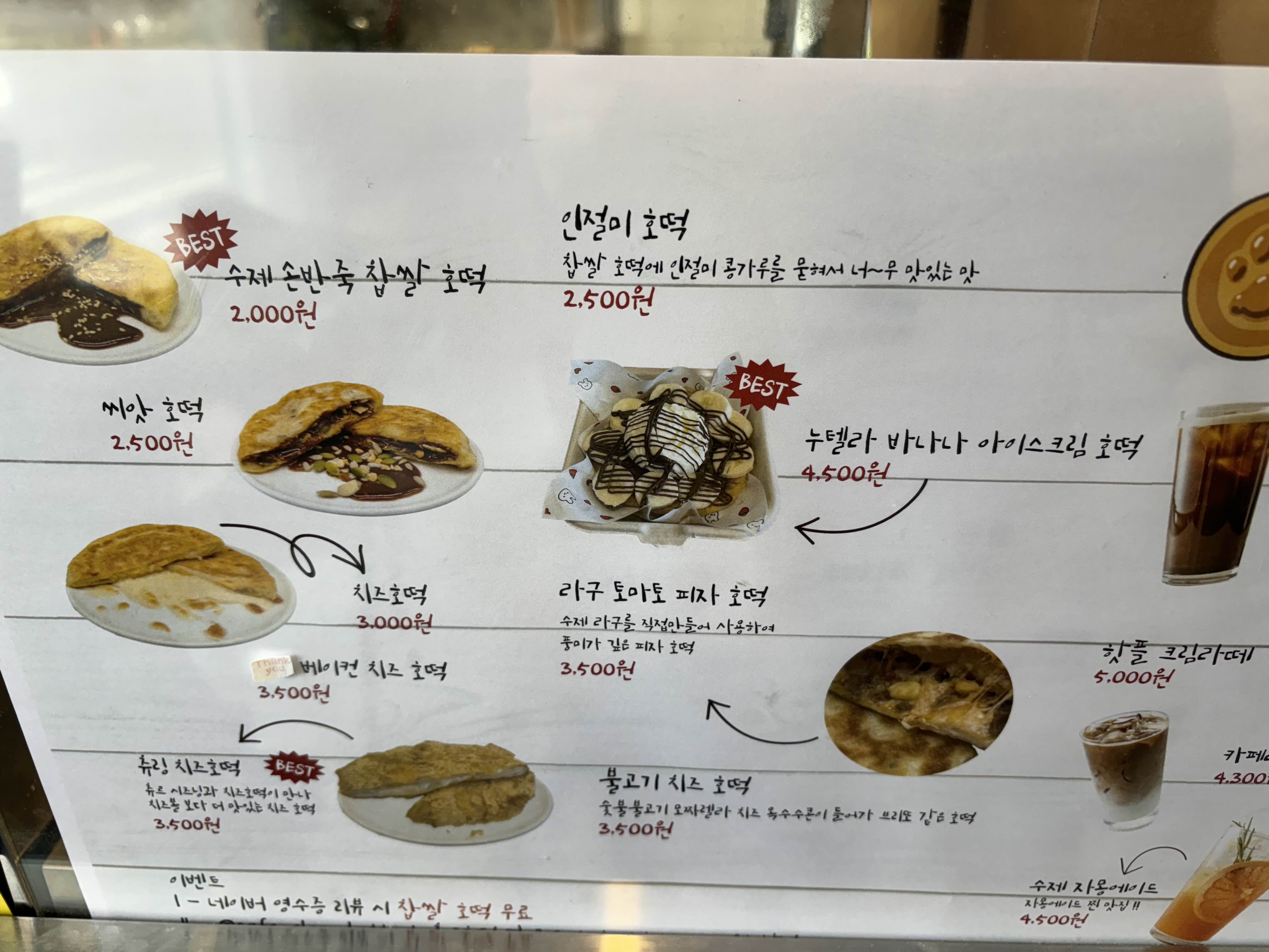 먹어 본 것은 수제 손반죽 찹쌀호떡(기본) / 씨앗호떡 / 치즈호떡 / 츄링 치즈호떡 / 불고기 치즈호떡이다.
