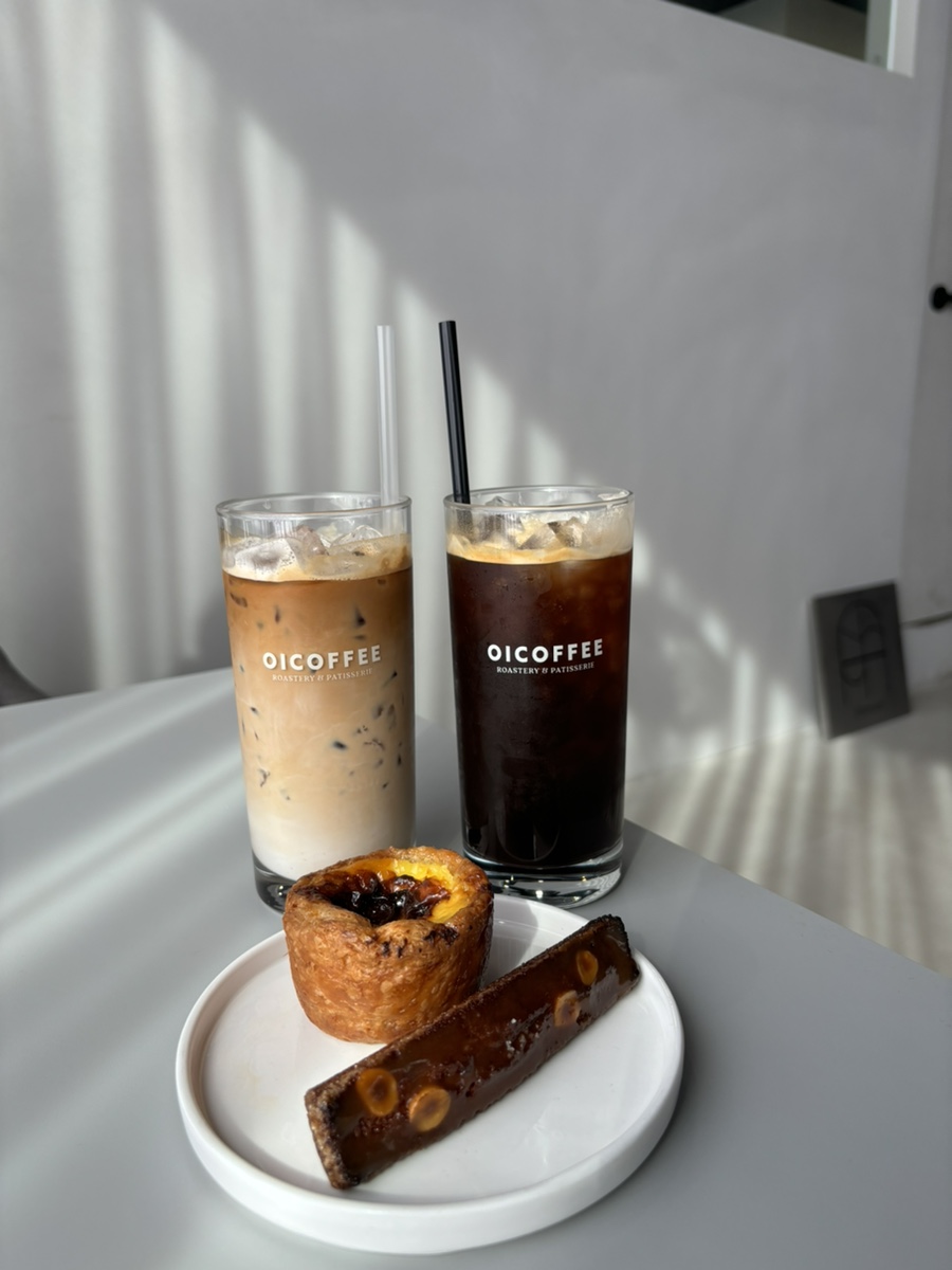 - 주문한 아이스 라떼와 아이스 아메리카노, 에그타르트와 솔트카라멜 휘낭시에가 나옴!