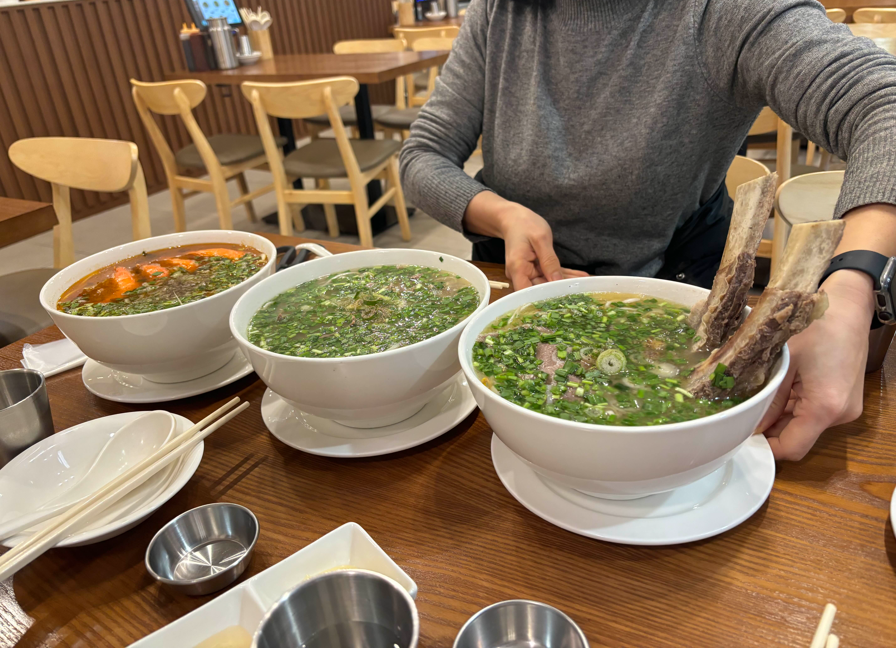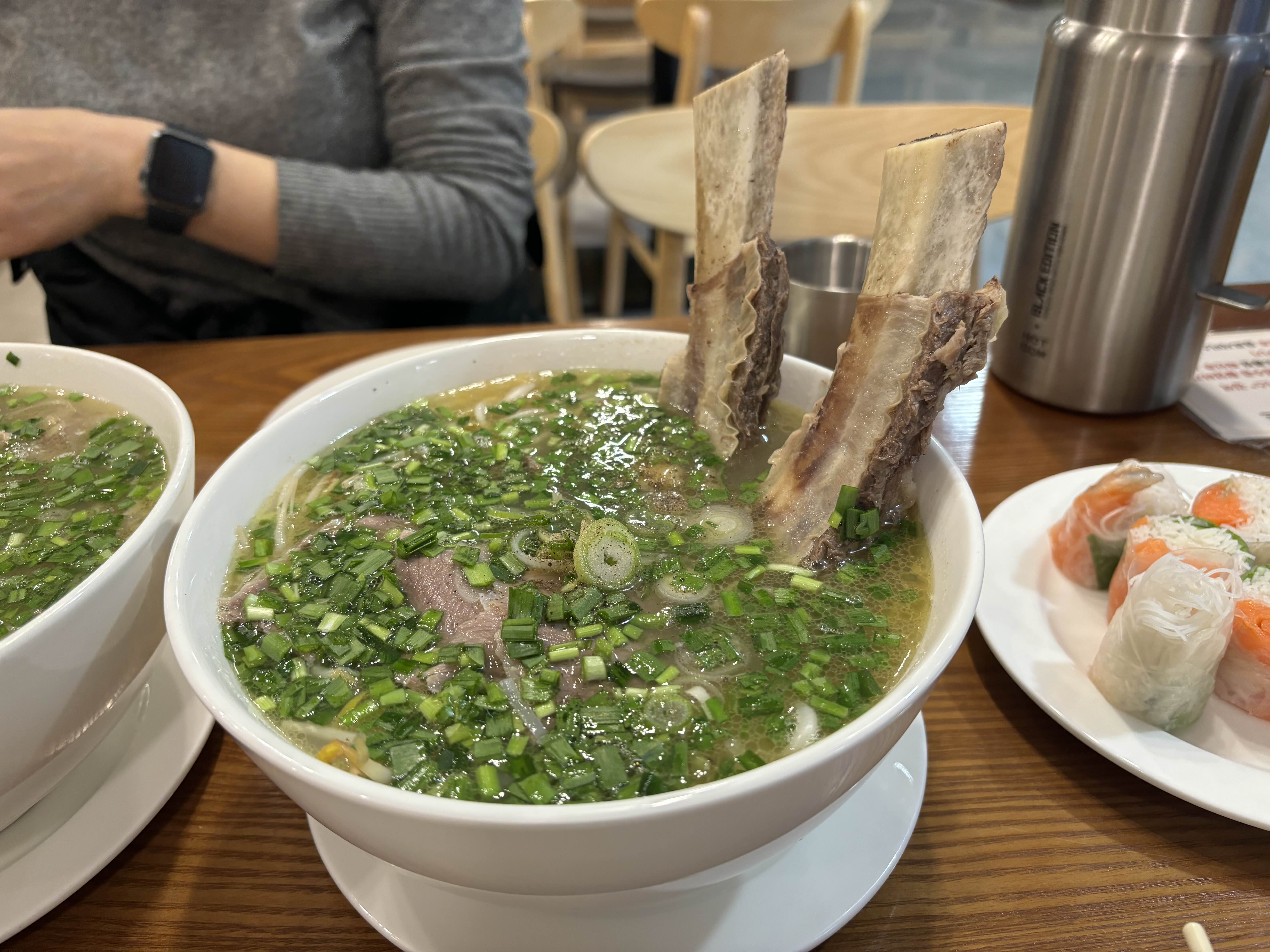 - 메인 쌀국수인 왕갈비 쌀국수(13.), 소고기 쌀국수(10.), 새우탕 쌀국수(11.5) 연어 스프링롤 8피스(7.)를 주문해서