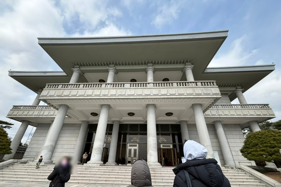 - 본관 외부에는 전통 건축양식의 팔작지붕에 15만 여장의 청기와를 올렸으며,