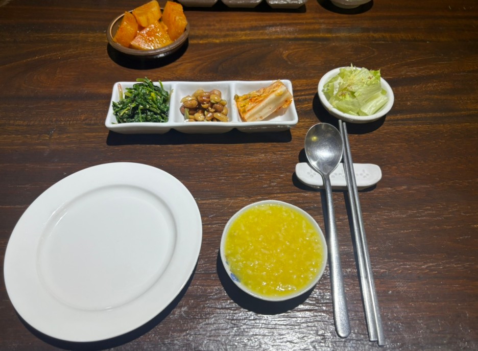 - 먼저 깍두기처럼 보이는 무조림과 조금 간간하게 무쳐진 시금치, 땅콩 볶음, 김치와 샐러드가 나오고
