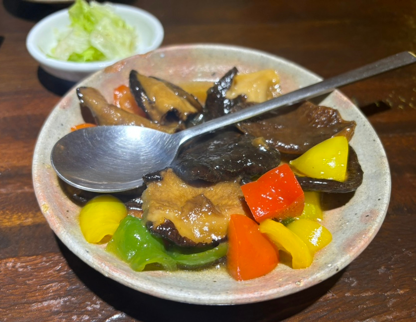 - 표고버섯은 튀기지 않고 질감을 잘 느낄 수 있게 조려져 나오는데 기분 좋은 달달함과 파프리카가 잘 어울렸다.