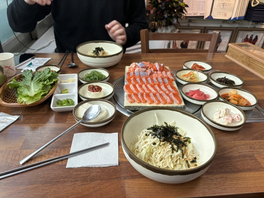 양배추와 쌈채소, 두부, 기본찬이랑 먹다 보면 생각보다 많이 배가 부르다.