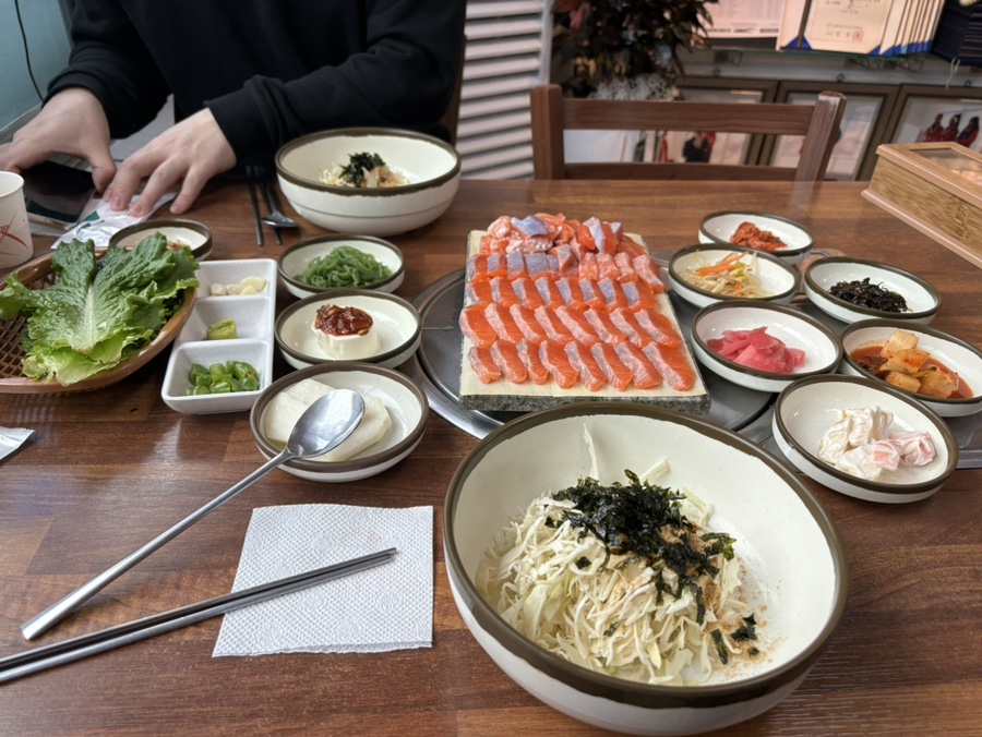양배추 채 썬 것 위에 미숫가루와 김가루가 뿌려져 있는데, 여기에 고추장을 뿌려 비벼 먹었다. 송어회랑 잘 어울린다.