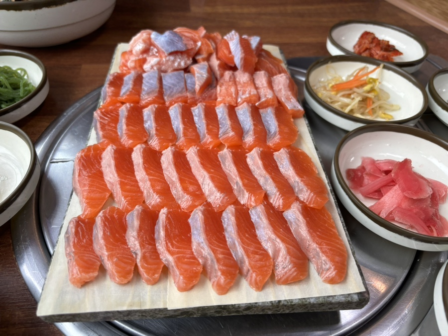 대망의 송어회다! 비주얼이 진짜 최고다! 색도 참 예쁘고 보이는 것처럼 쫀득쫀득 야들야들한 송어회! 게 눈 감추듯 먹었다.