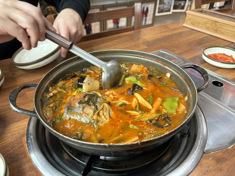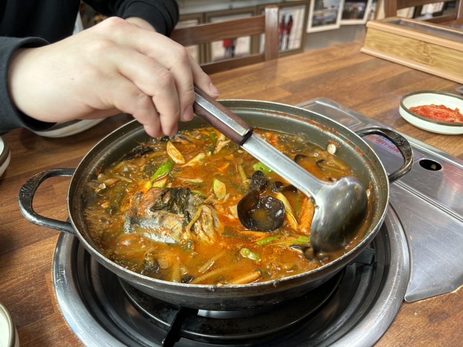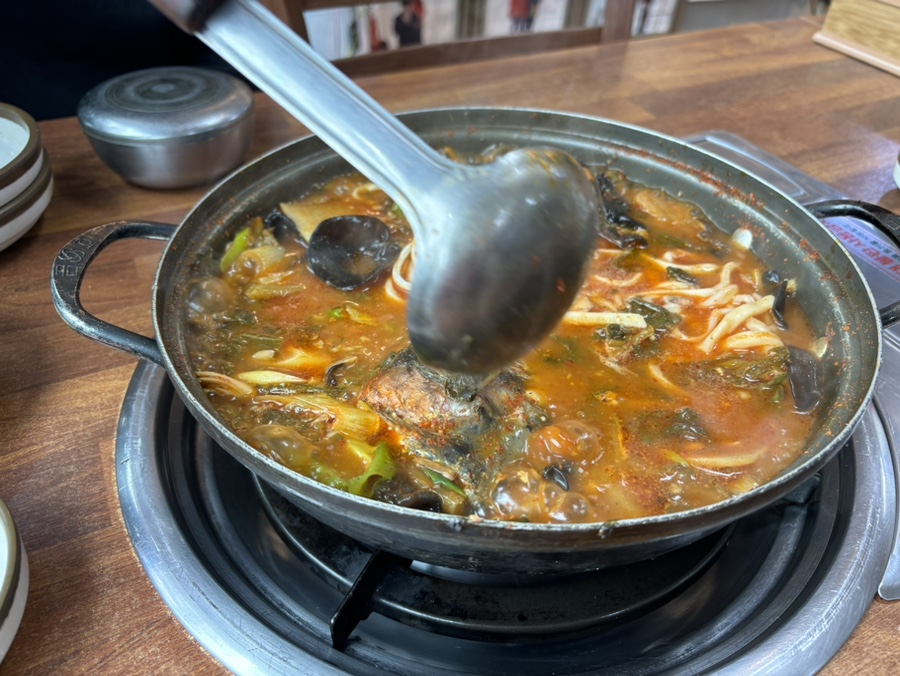대망의 매운탕! 얼큰하고 시원한 국물에 송어 살도 많이 들어있었다. 목이버섯이랑 파, 갓이 팍팍 들어가 있다.