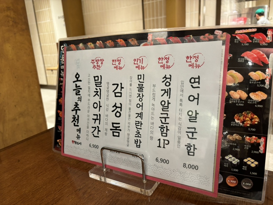 오늘의 추천메뉴도 있었는데, 감성돔은 한정메뉴라 품절되어서 맛볼 수 없었다.