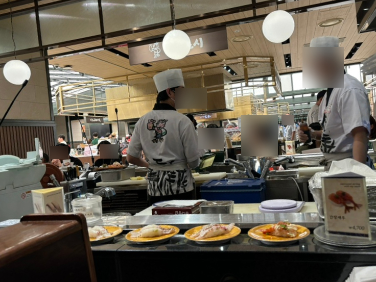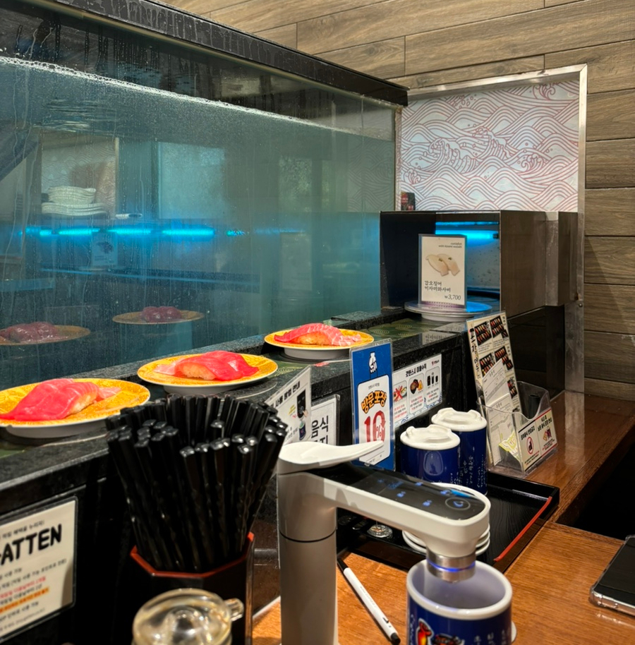 갓덴스시는 회전초밥집인데, 뒤편에 테이블이 있었다! 운 좋게 테이블 쪽으로 안내를 받았다. 회전초밥집은 난생처음이다. 초밥 좋아하는데 의외로 가본 적이 없음...