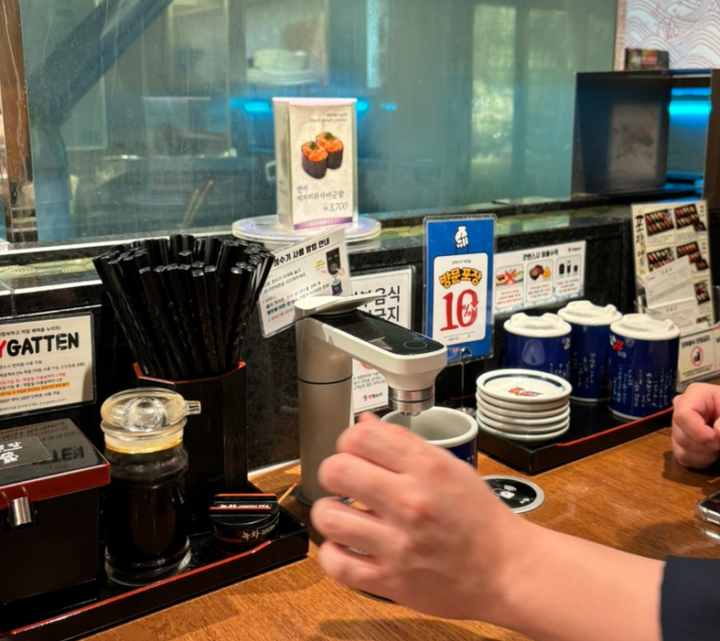 말차를 만들어먹을 수 있다. 뜨겁게, 차갑게 둘 다 가능! 테이블마다 정수기가 있었다.