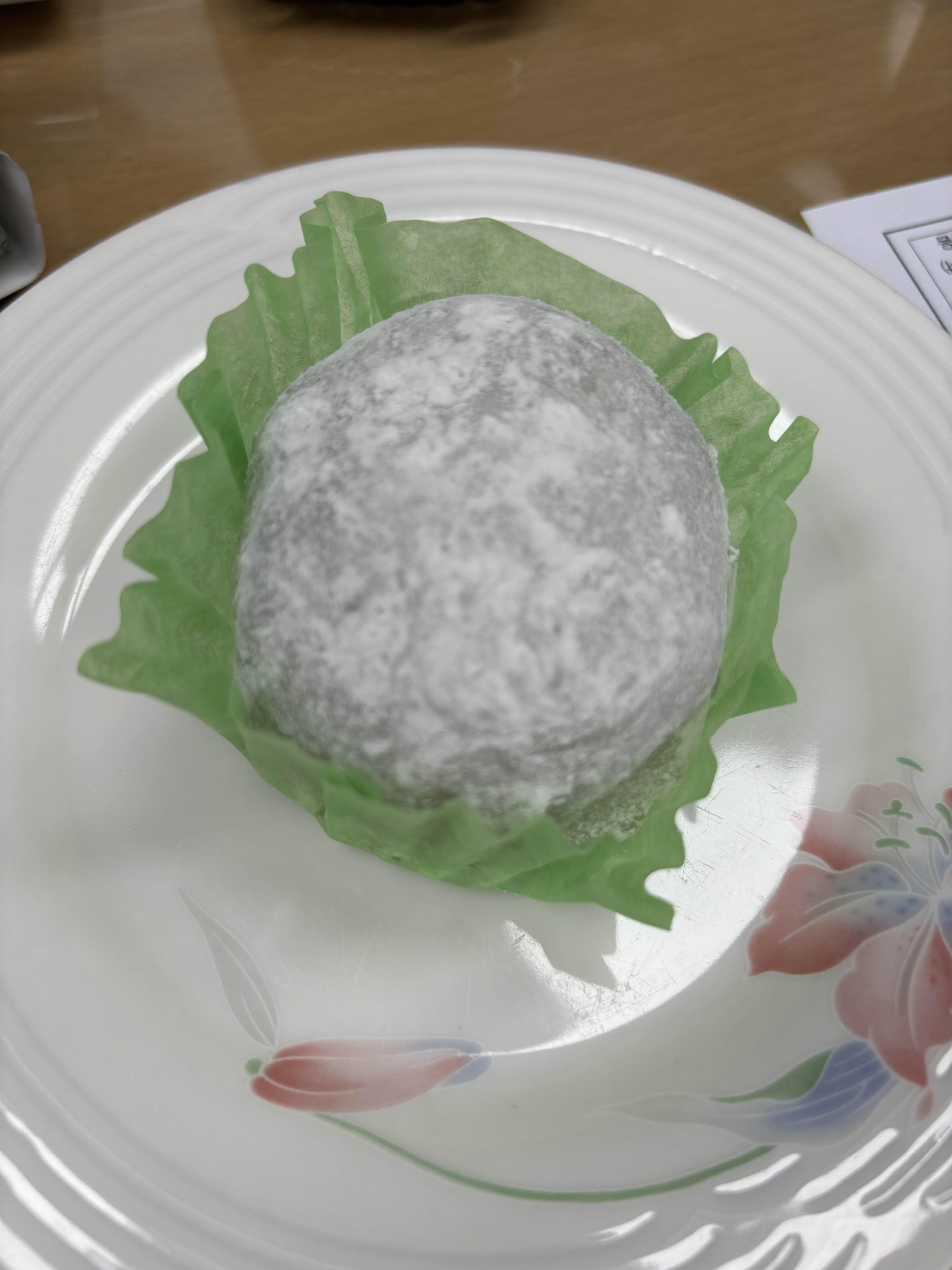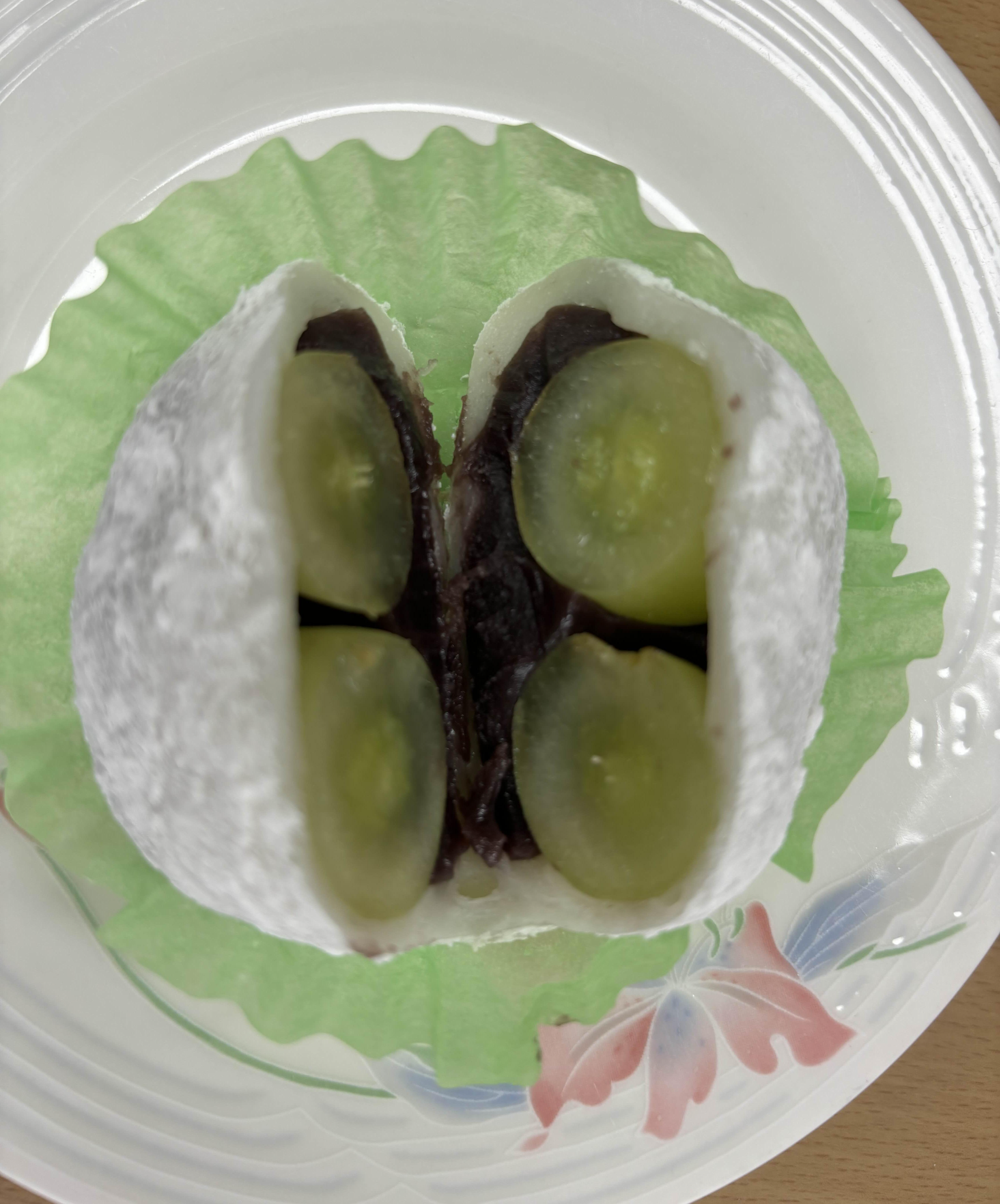 샤인머스캣 모찌는 샤인머스켓이 2알 들었다! 딸기 모찌랑 비슷한 느낌! 과일과 모찌 조합은 색다르지만 내 취향은 아니었다. 뭔가 따로 노는 느낌을 지울 수가 없음. 찹쌀떡은 견과류나 팥소, 꿀 조합이 너무 익숙하긴 하다.