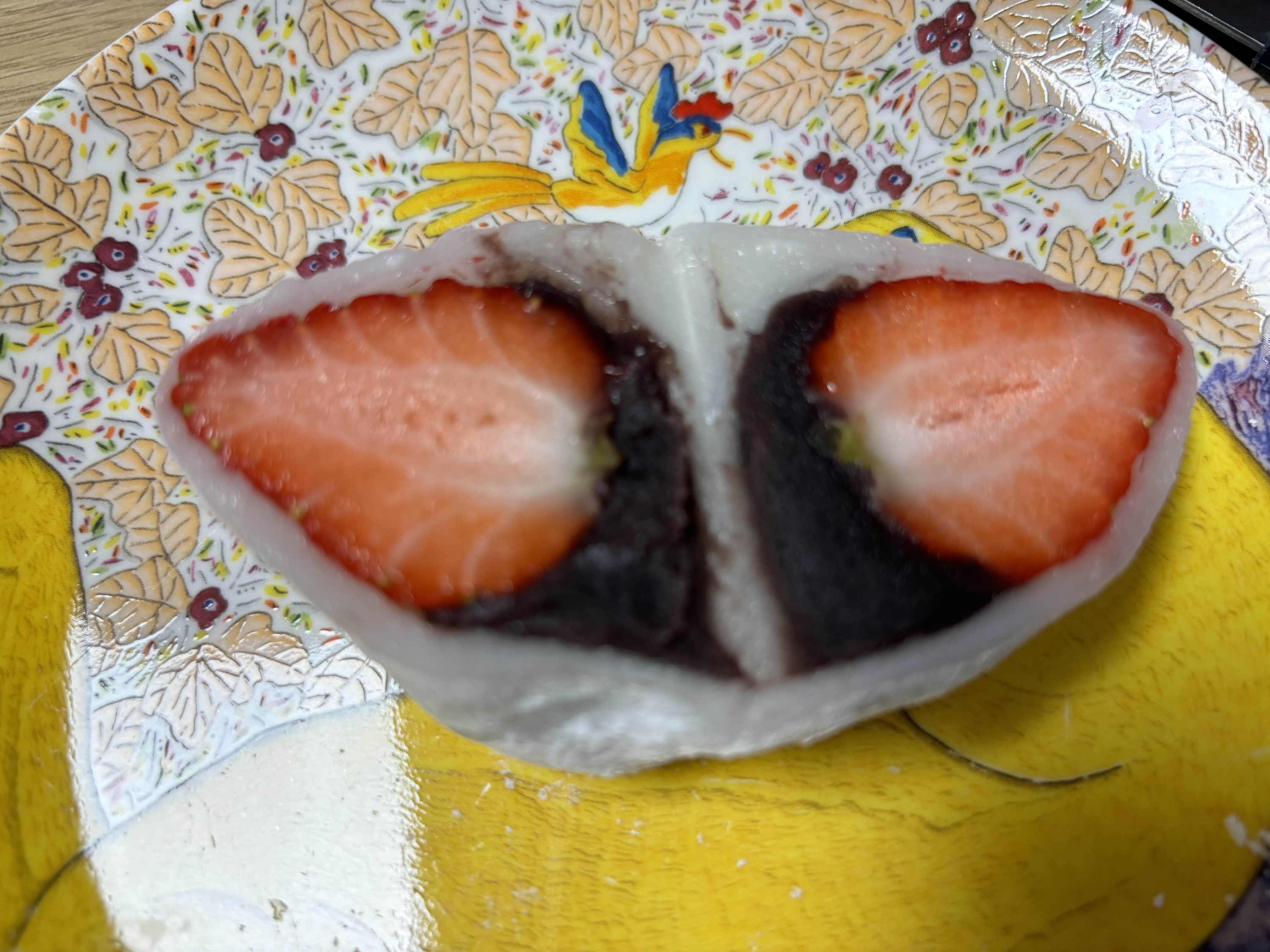 가장 기대했던 딸기 모찌는 찹쌀떡 부분이 얄상하고 딸기는 향긋하고 달달한 설향 딸기인 듯! 아래는 팥소가 들어있다. 조금씩 베어무는 것보다 한꺼번에 씹어서 섞인 맛이 훨씬 괜찮다. 따로따로 씹어먹으면 왜인지 쓴 맛이 올라온다.