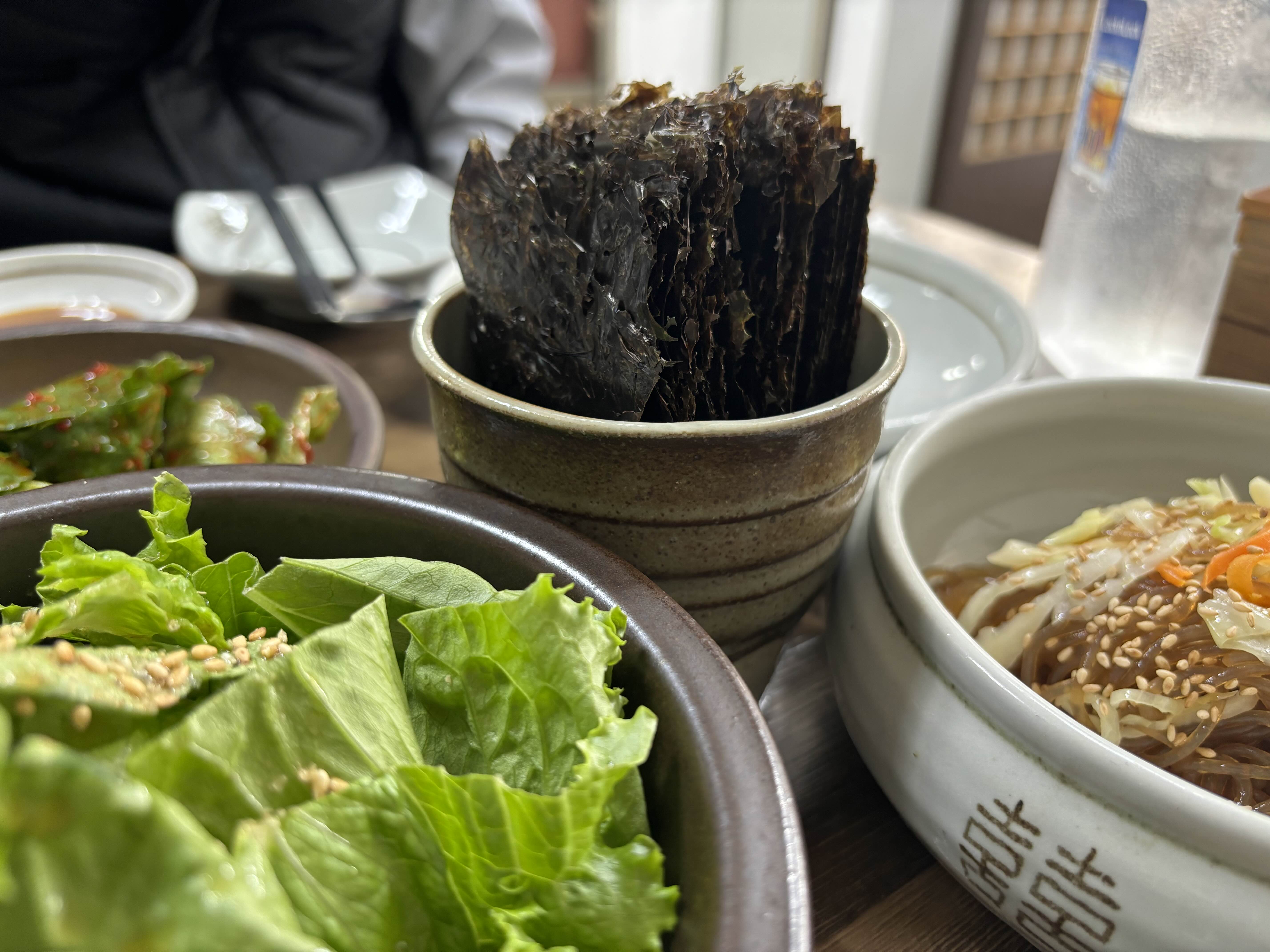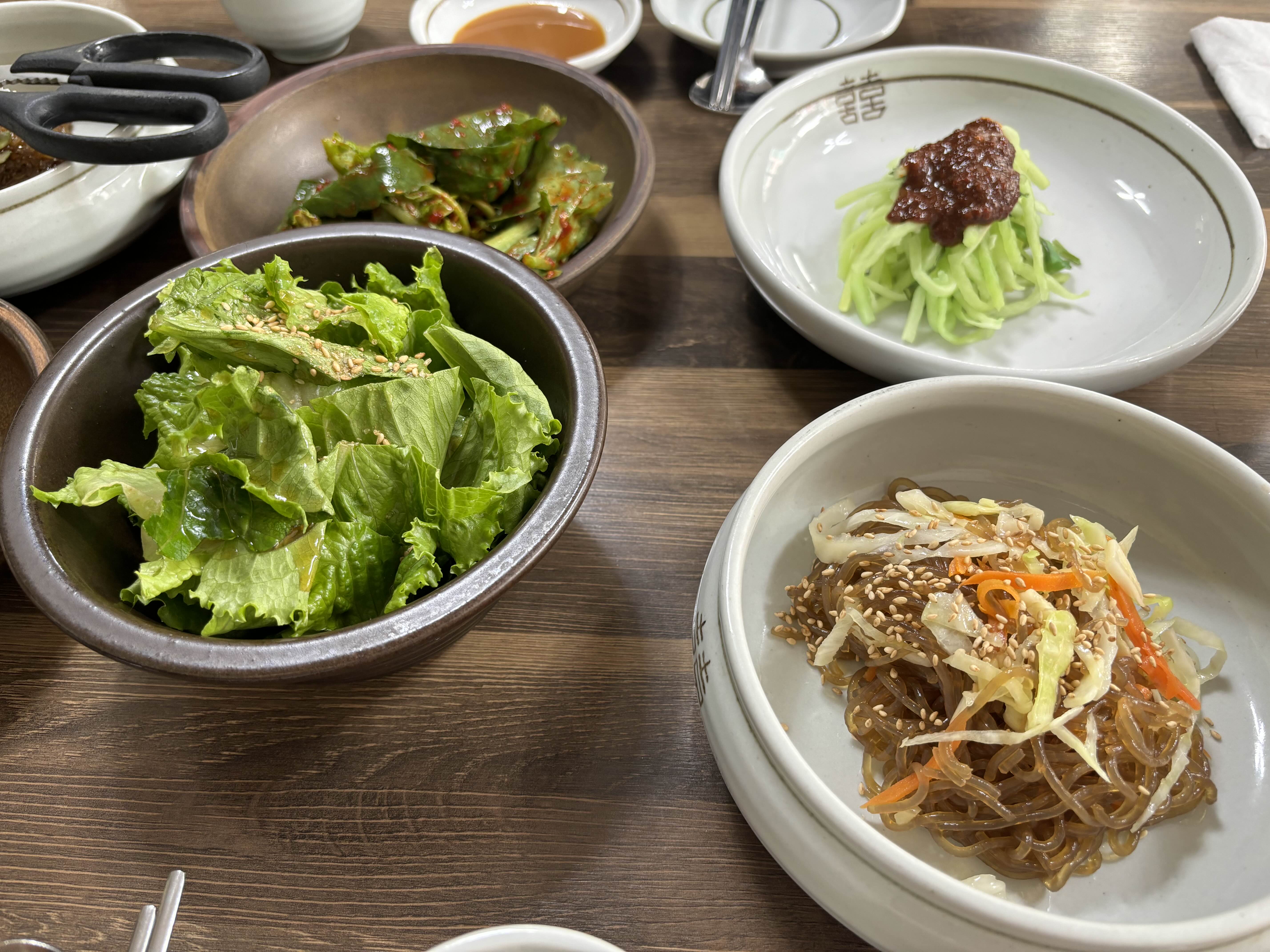 약밥, 묵은지찜, 채소 겉절이, 채소무침, 잡채가 엄청 정갈하다. 밑반찬이 참 맛있는 집이다. 그릇도 고급스러웠다. 밑반찬이 완전 훌륭해서 본음식에 대한 기대감이 엄청 커졌다.