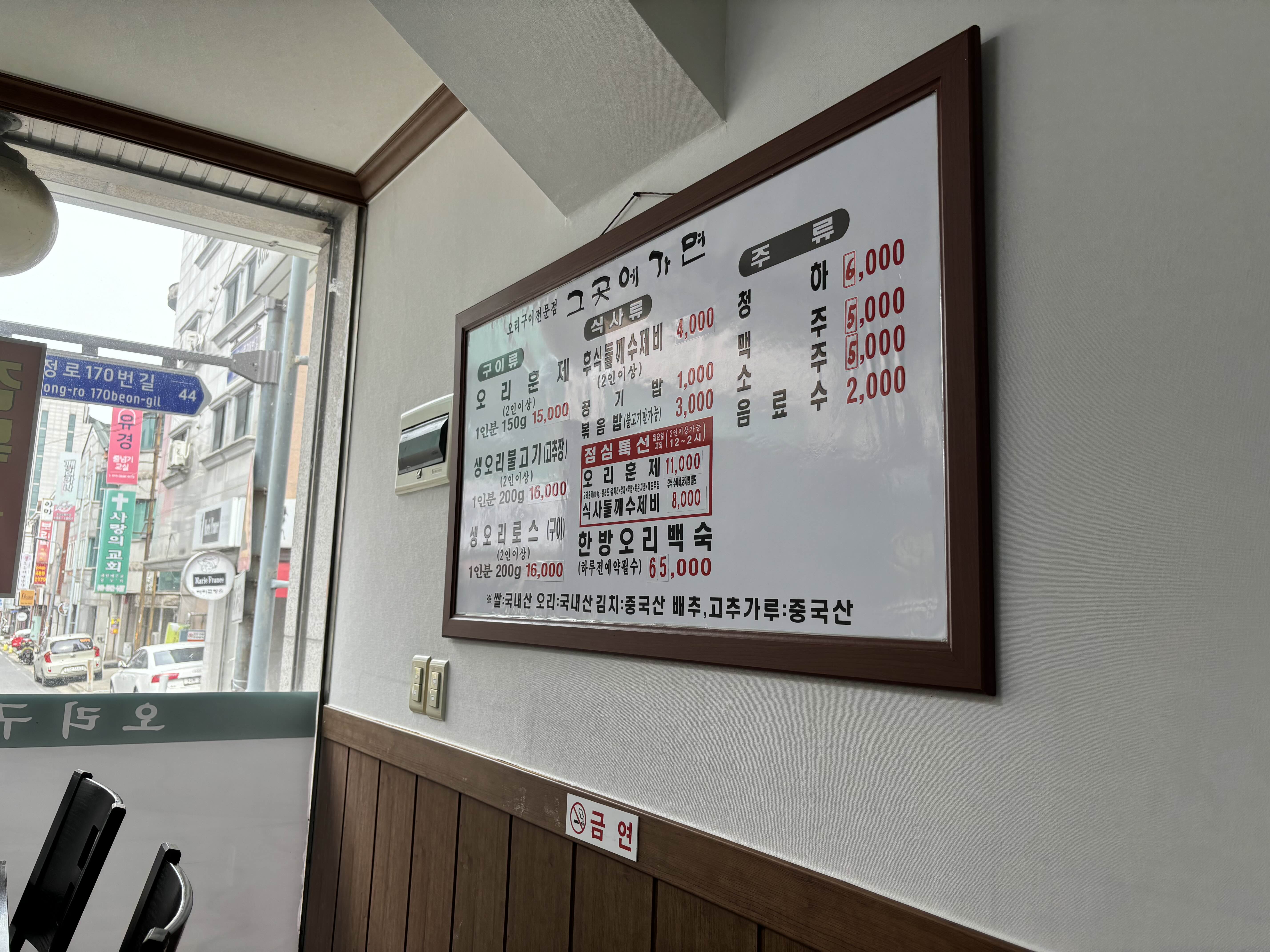 오리 훈제가 인당 11,000원인데, 샐러드, 겉절이, 잡채, 약밥, 묵은지찜, 채소무침이 포함되어 있다. 후식 수제비와 공기밥은 별도로 주문해야 한다.